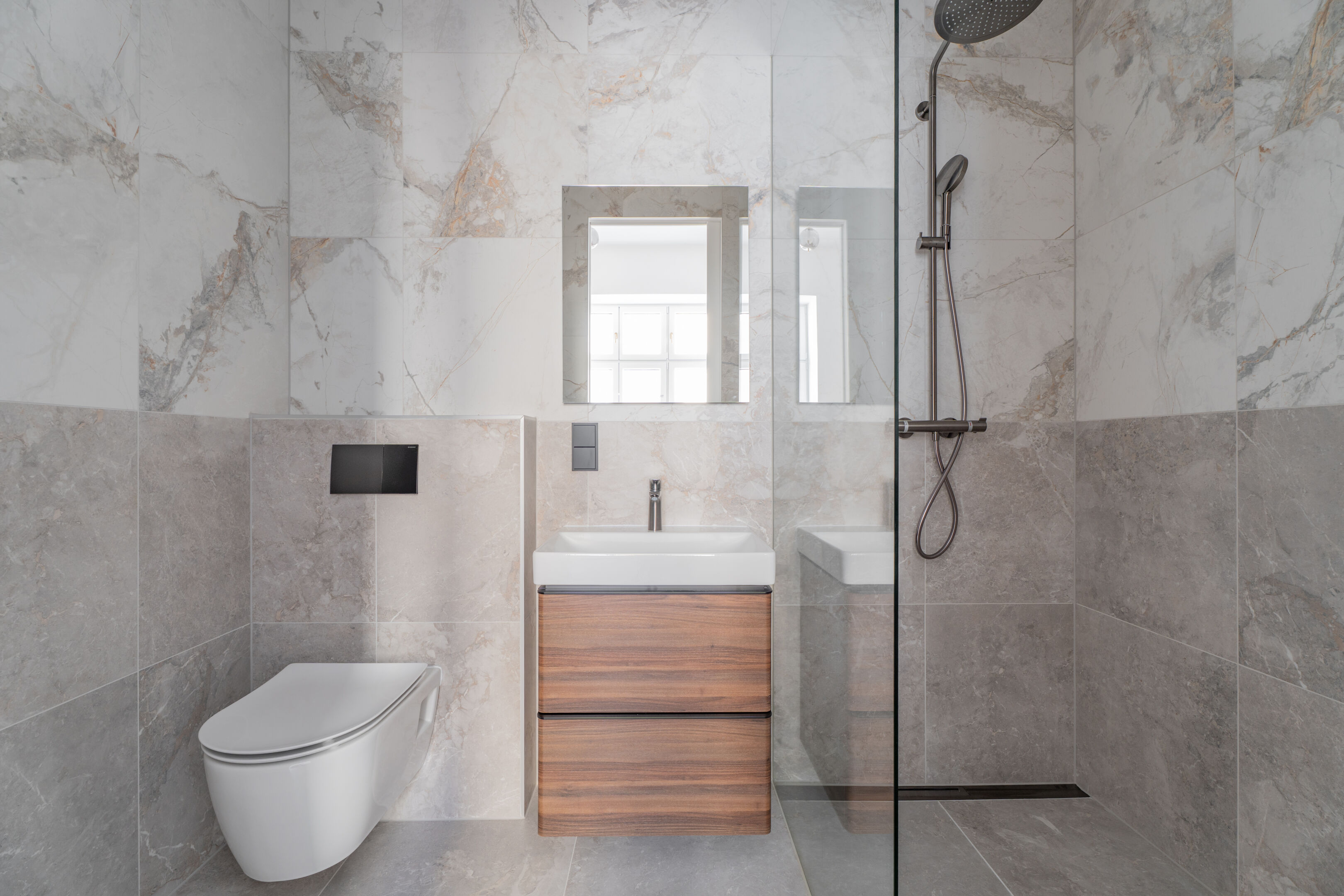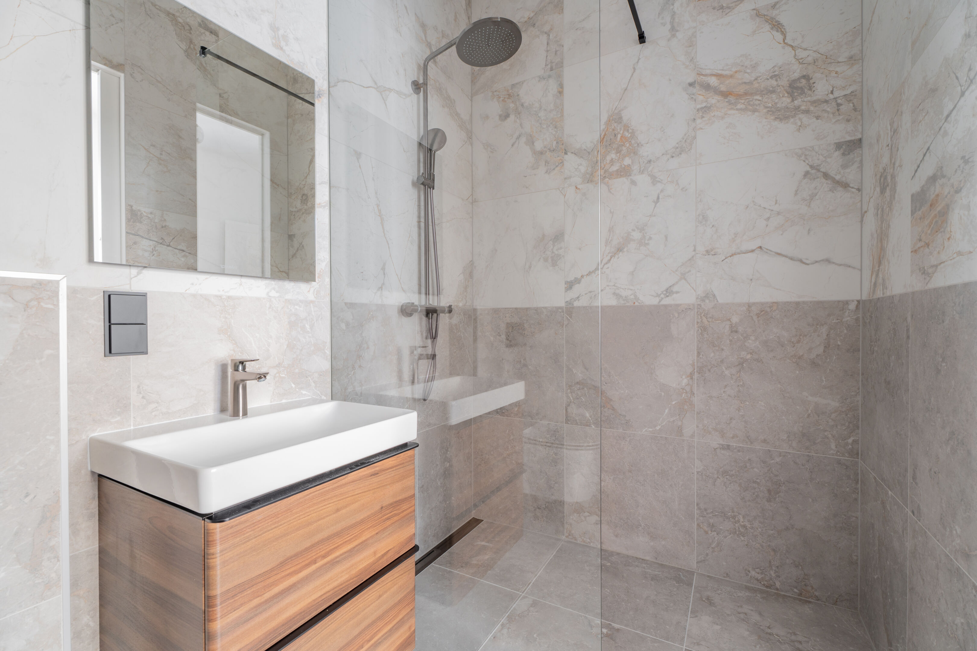 • Zweites Badezimmer mit bodenebener Dusche und Waschtisch