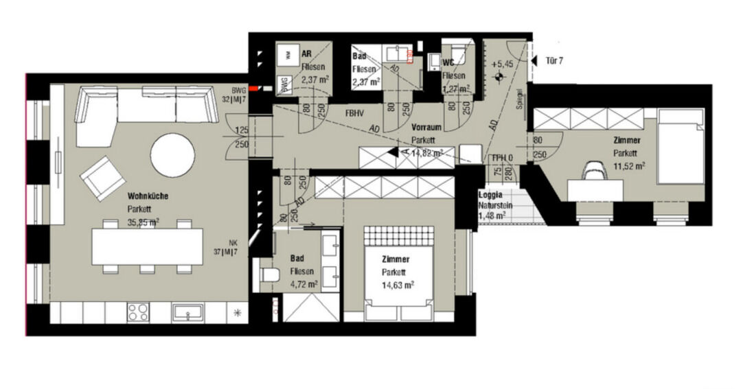 Sämtliche Räume sind zentral vom Vorraum aus begehbar: