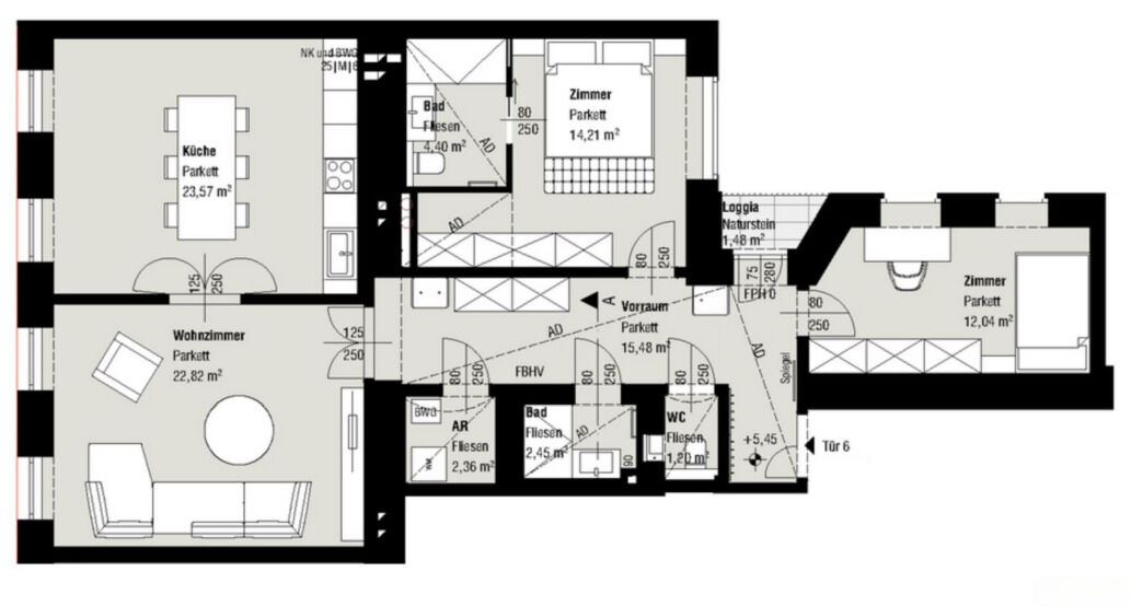 - Innentüren in „Alt-Wien“-Optik mit Kassetten und Holzumfassungszarge, Höhe 2,50 m