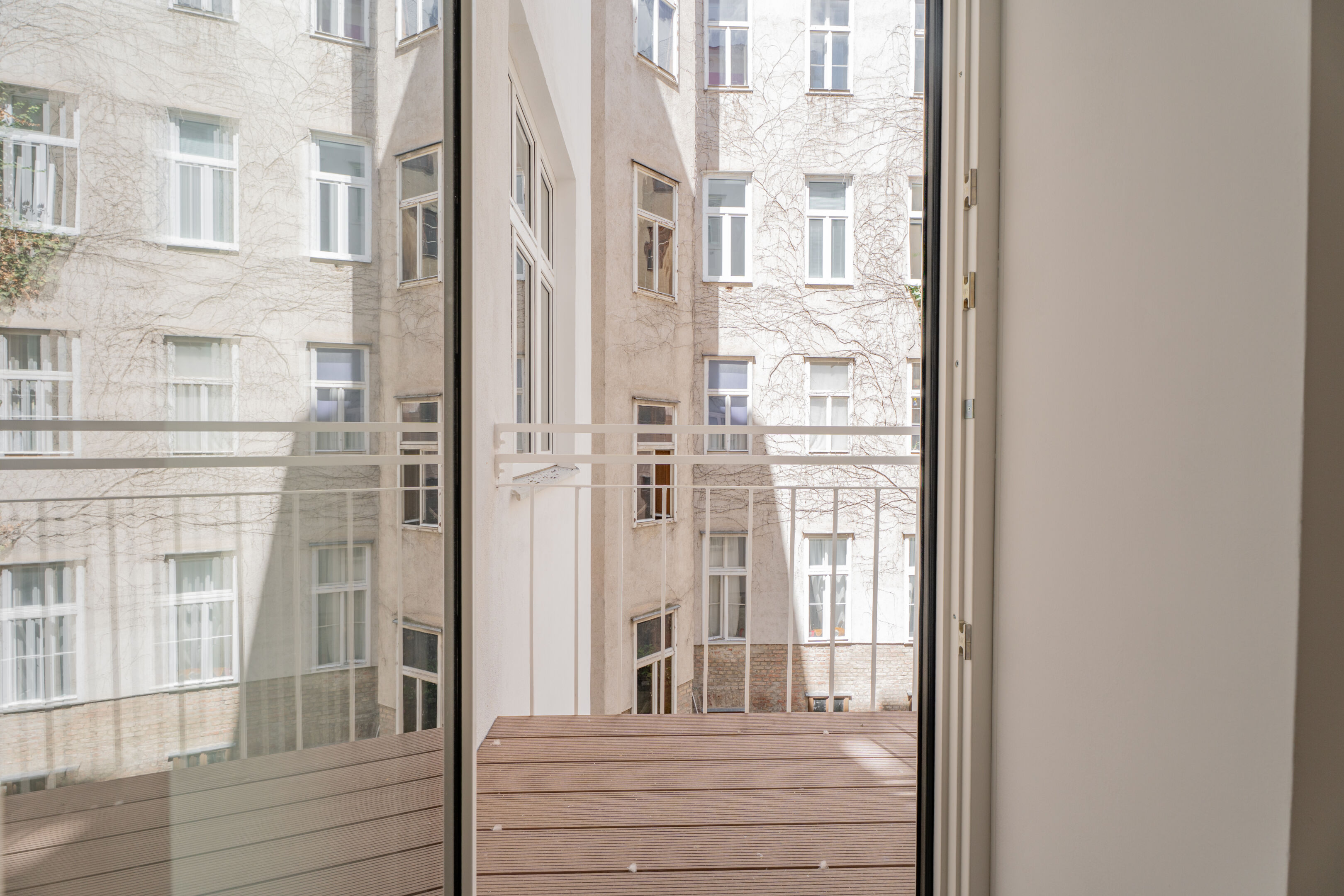 - Loggia mit Blick in den begrünten Innenhof – ein ruhiger Ort zum Entspannen