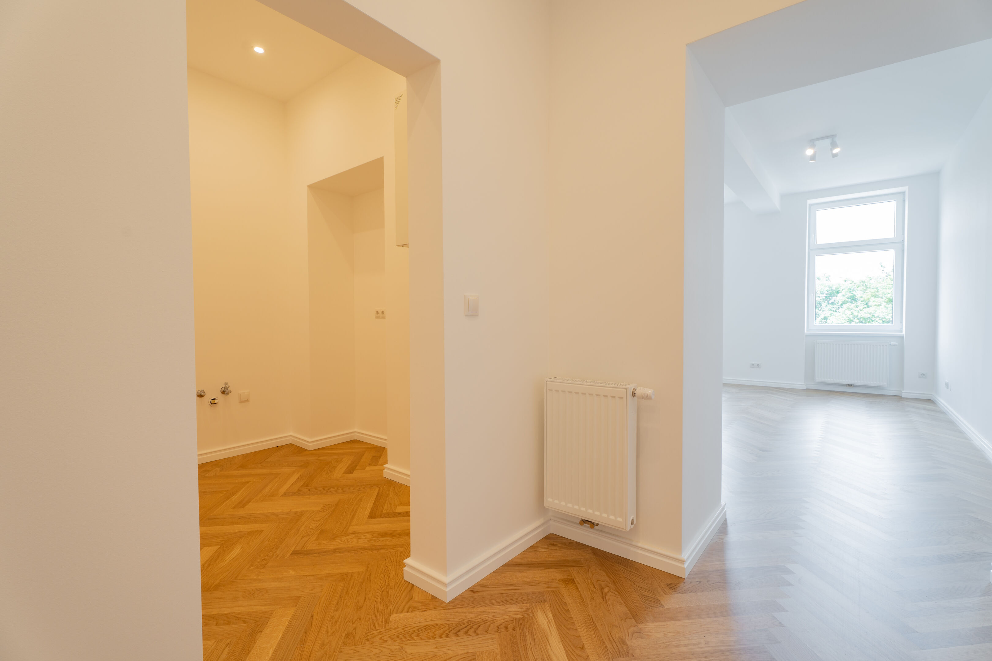 Zum Verkauf gelangt ein generalsanierter 3-Zimmer Erstbezug mit knapp 58m² im 3.Stock mit Blick auf den Laubepark. Die Altbauwohnung ist nach Westen ausgerichtet, wurde hochwertig saniert und teilt sich wie folgt auf:
