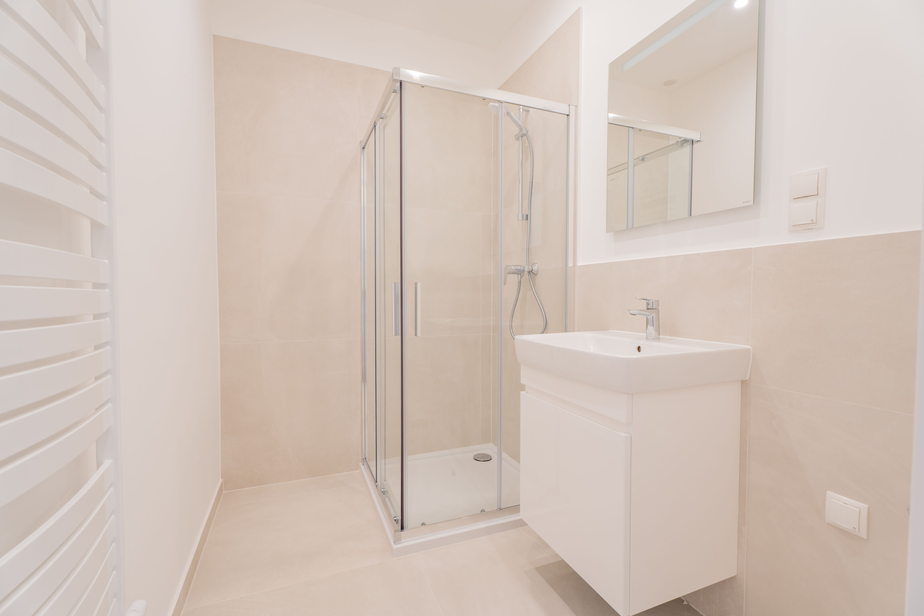 - Badezimmer mit Dusche und Waschmaschinenanschluss