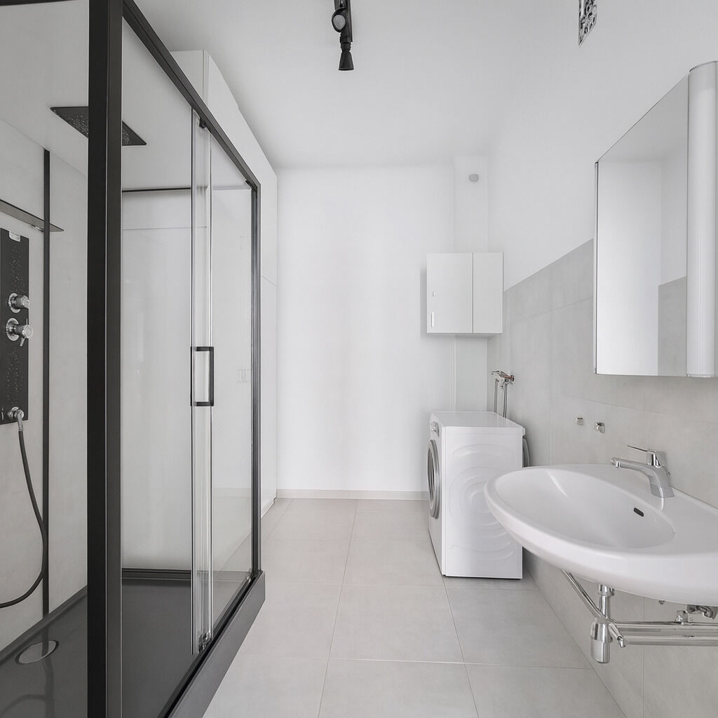 Das moderne Badezimmer ist mit einer Badewanne und einer Dusche ausgestattet und präsentiert sich in einem gepflegten, zeitgemäßen Stil. Ein separates WC ergänzt das funktionale Raumkonzept und unterstreicht die Alltagstauglichkeit dieser Immobilie.