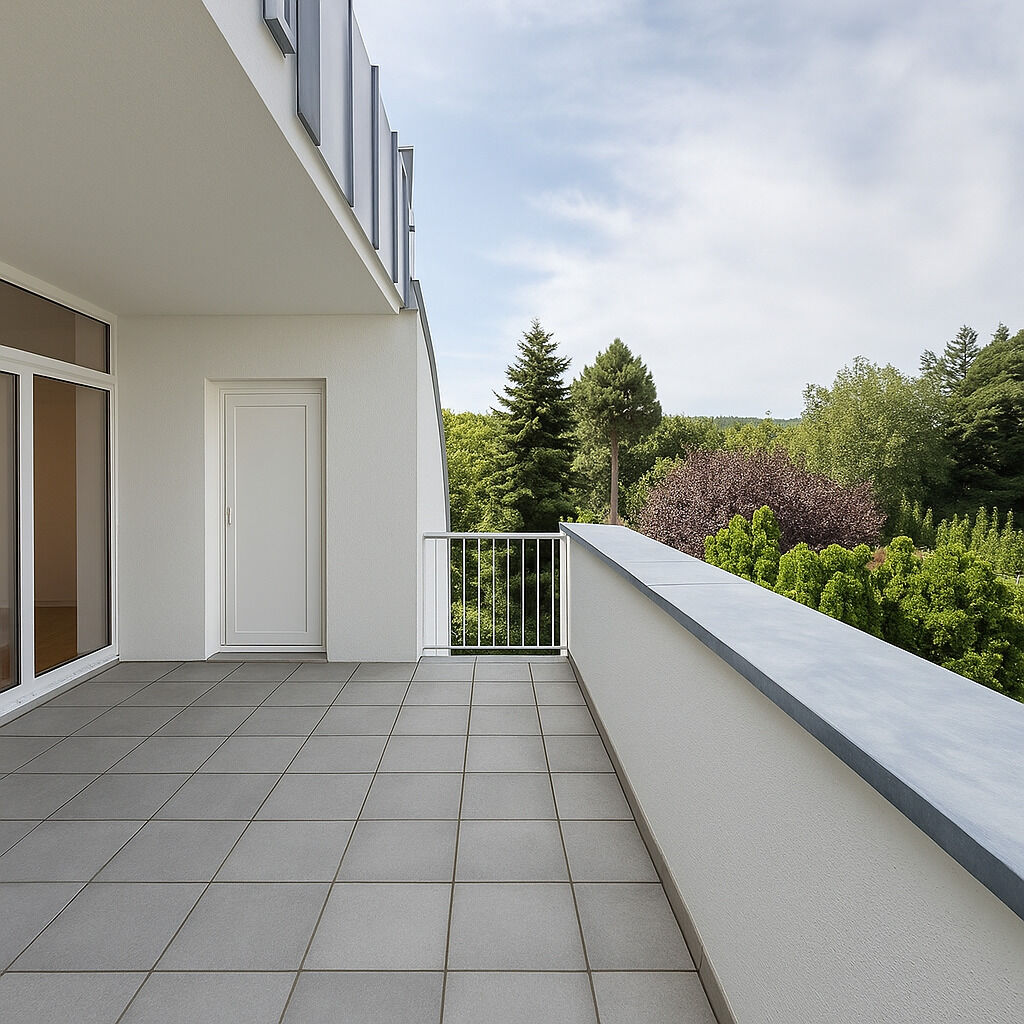 Auf den Freibereichen gelangen pflegeleichte Betonsteinplatten zum Einsatz, die durch eine hohe Widerstandsfähigkeit punkten. Glasgeländer unterstreichen die zeitlos schöne Eleganz und kreieren in Verbindung mit der Umgebung eine einzigartige Atmosphäre zum Verweilen und Wohlfühlen.
