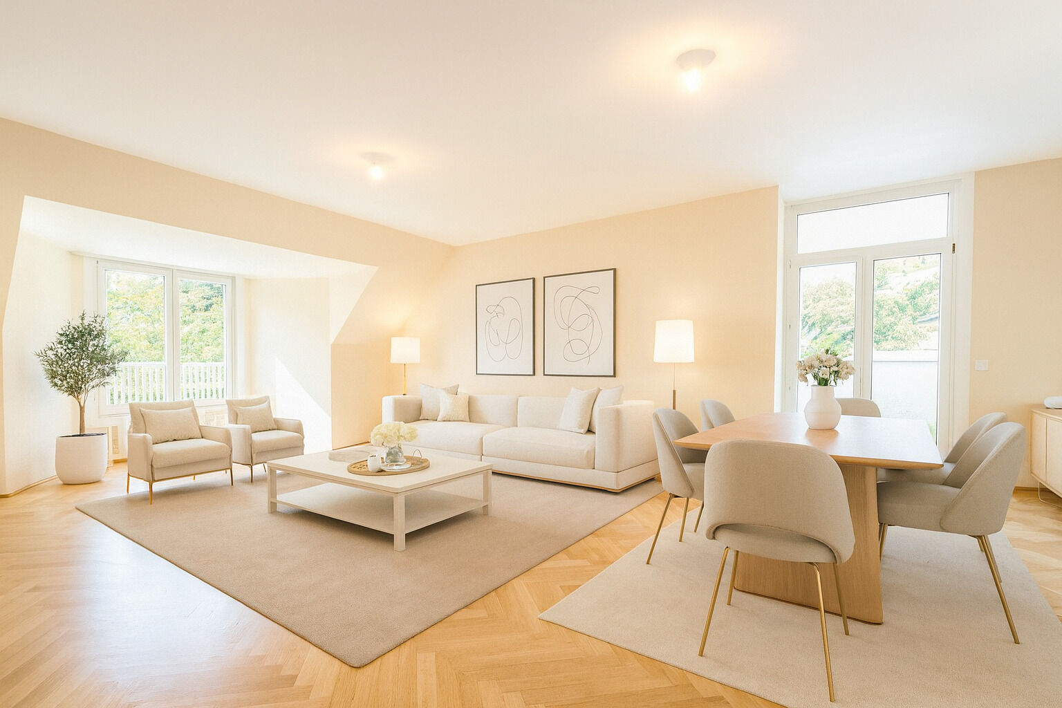 Die offene Architektur der Wohnungen korrespondiert geschmackvoll mit der genussreichen Umgebung. Großzügige Verglasungen und fließende Übergänge von der Wohnebene auf die attraktiven Balkone, Terrassen und Eigengärten vermitteln ein von Harmonie geprägtes Wohngefühl.