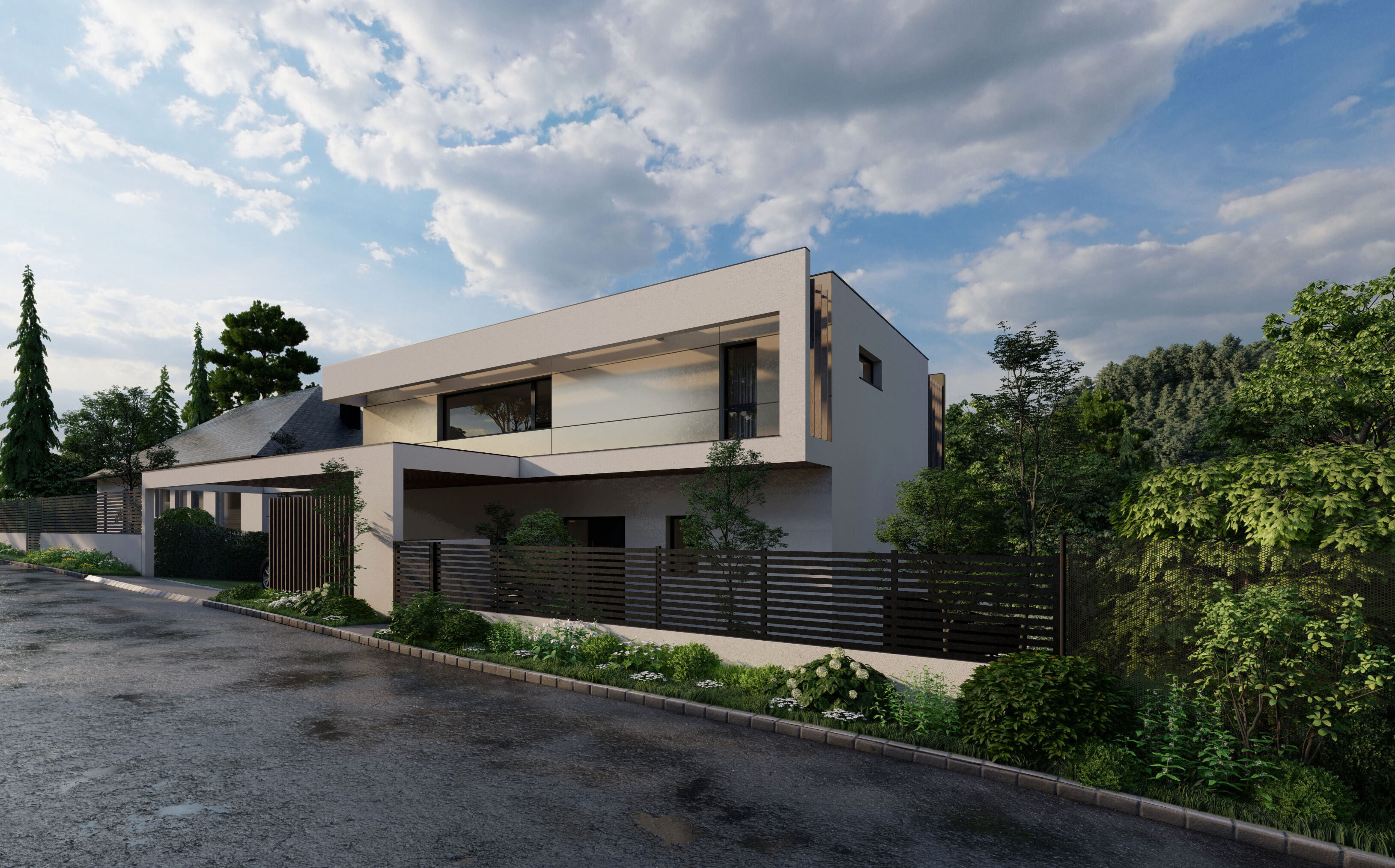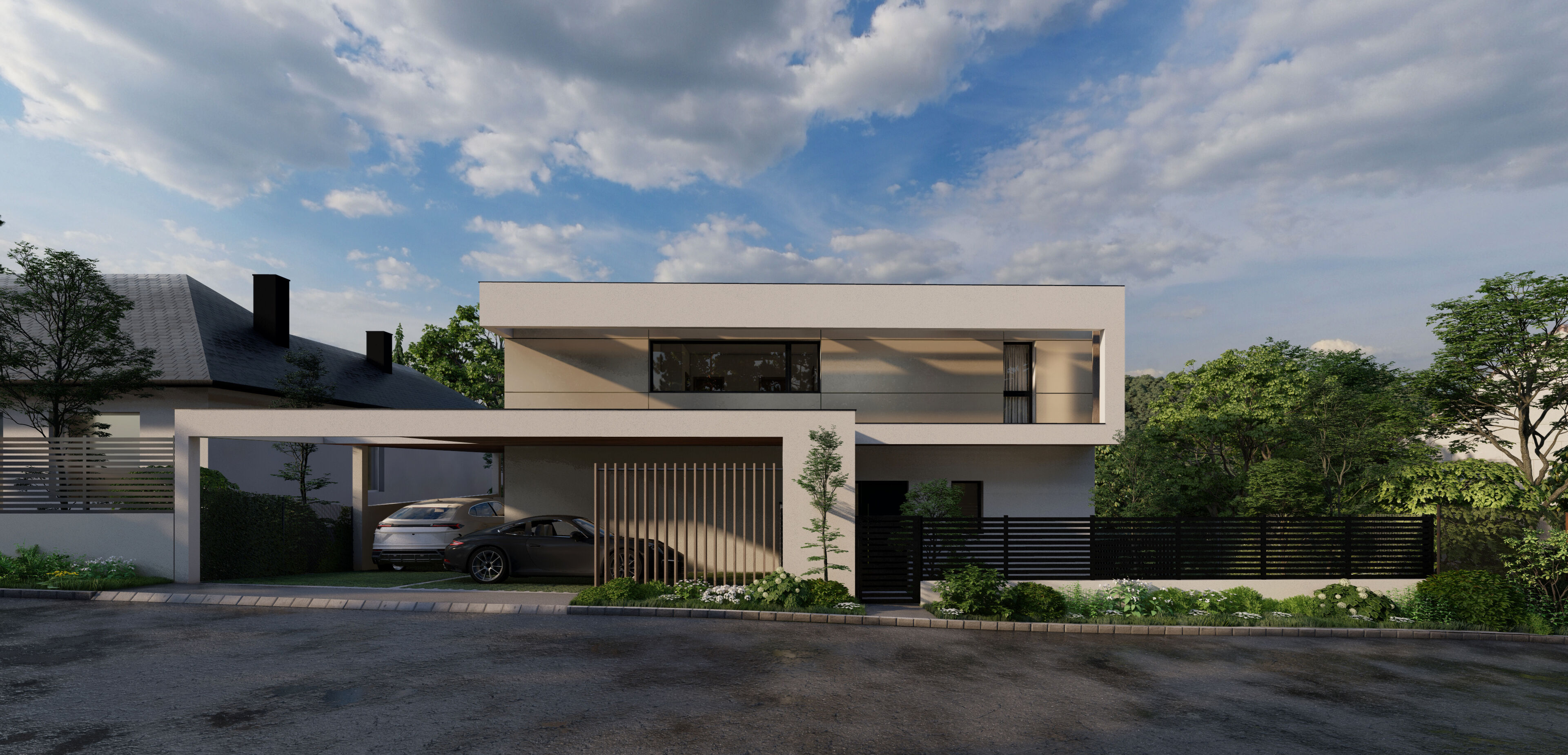 Die Villa überzeugt durch klare Linien und eine hochwertige Bauweise, die Eleganz und Beständigkeit verbindet. Der repräsentative Vorgarten, moderne Pflanzbeete und zwei Autoabstellplätze bilden den stilvollen Auftakt zu dieser besonderen Residenz.