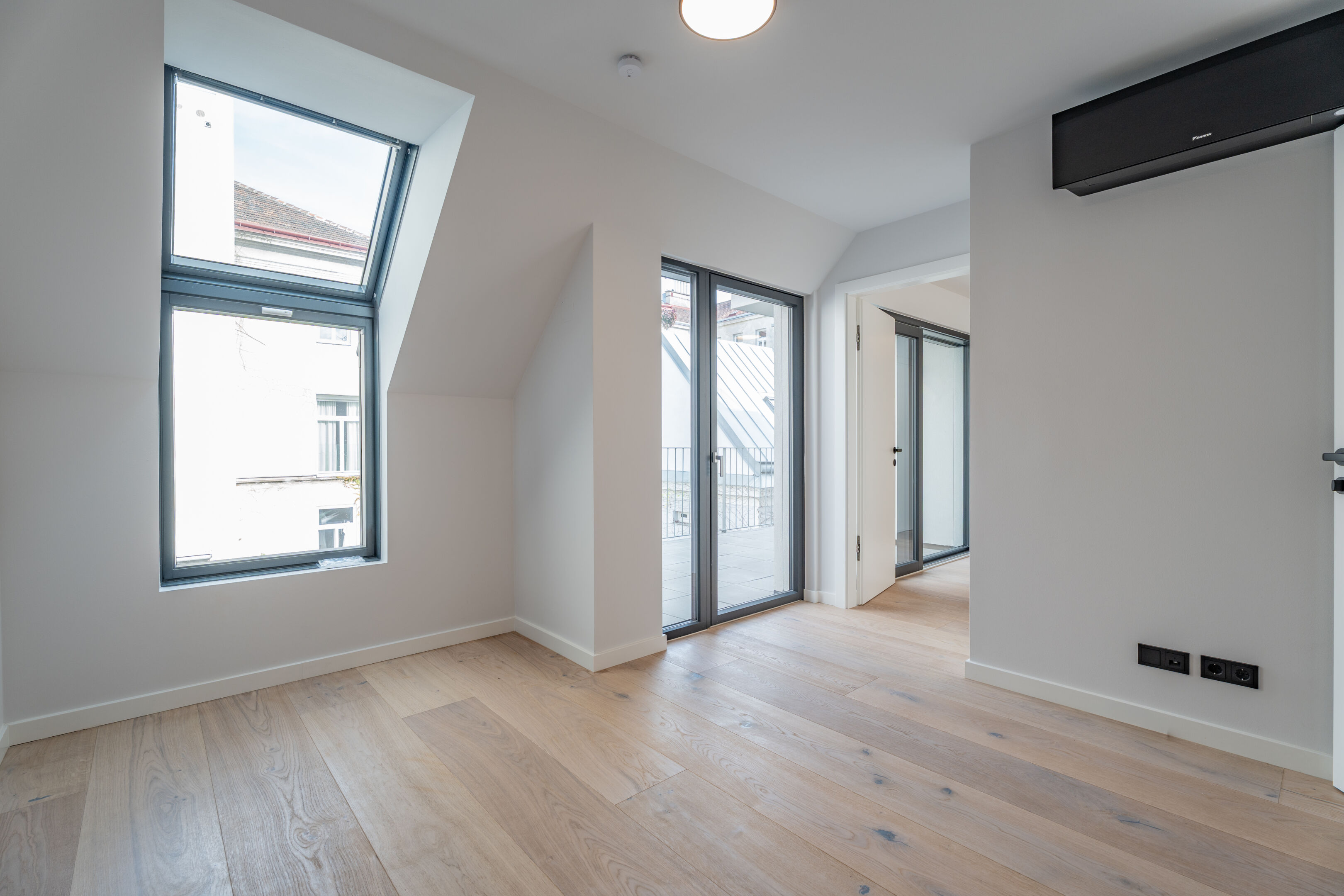 Die Dachgeschosswohnungen – drei Einheiten im 1. Dachgeschoß und das Penthouse im 2. Dachgeschoß – bilden das architektonische Highlight des Projekts. Großzügige Fensterfronten lassen die lichtdurchfluteten Räume erstrahlen und eröffnen eindrucksvolle Ausblicke über die Stadt.
