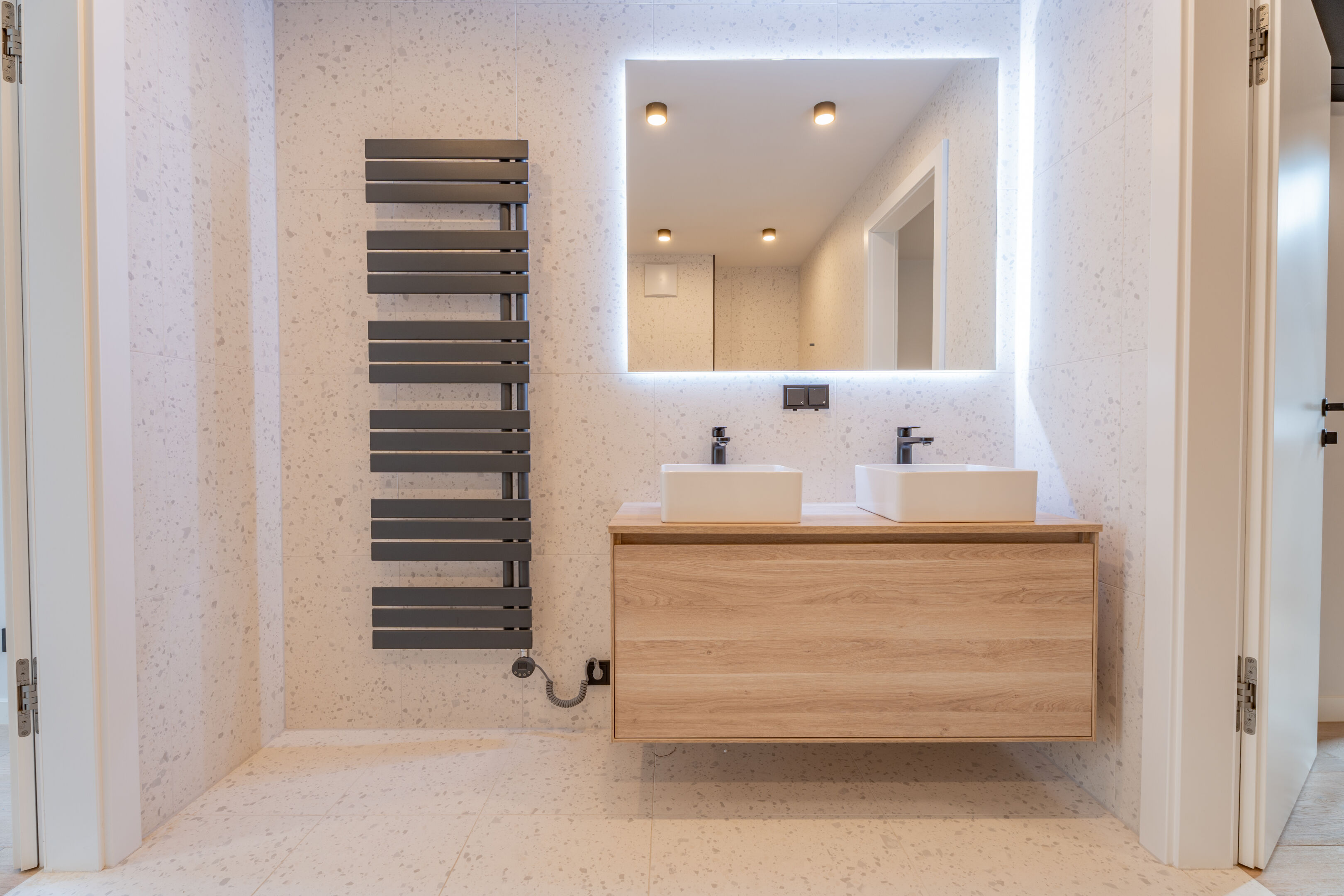 Zwischen den beiden Schlafzimmern befindet sich das stilvolle Badezimmer, das von beiden Seiten zugänglich ist und mit einer gemütlichen Badewanne, einer Walk-In-Dusche, einem Doppelwaschtisch sowie einem weiteren WC höchsten Komfort bietet. Ein praktischer Abstellraum mit Waschmaschinenanschluss rundet das durchdachte Wohnkonzept ideal ab.
