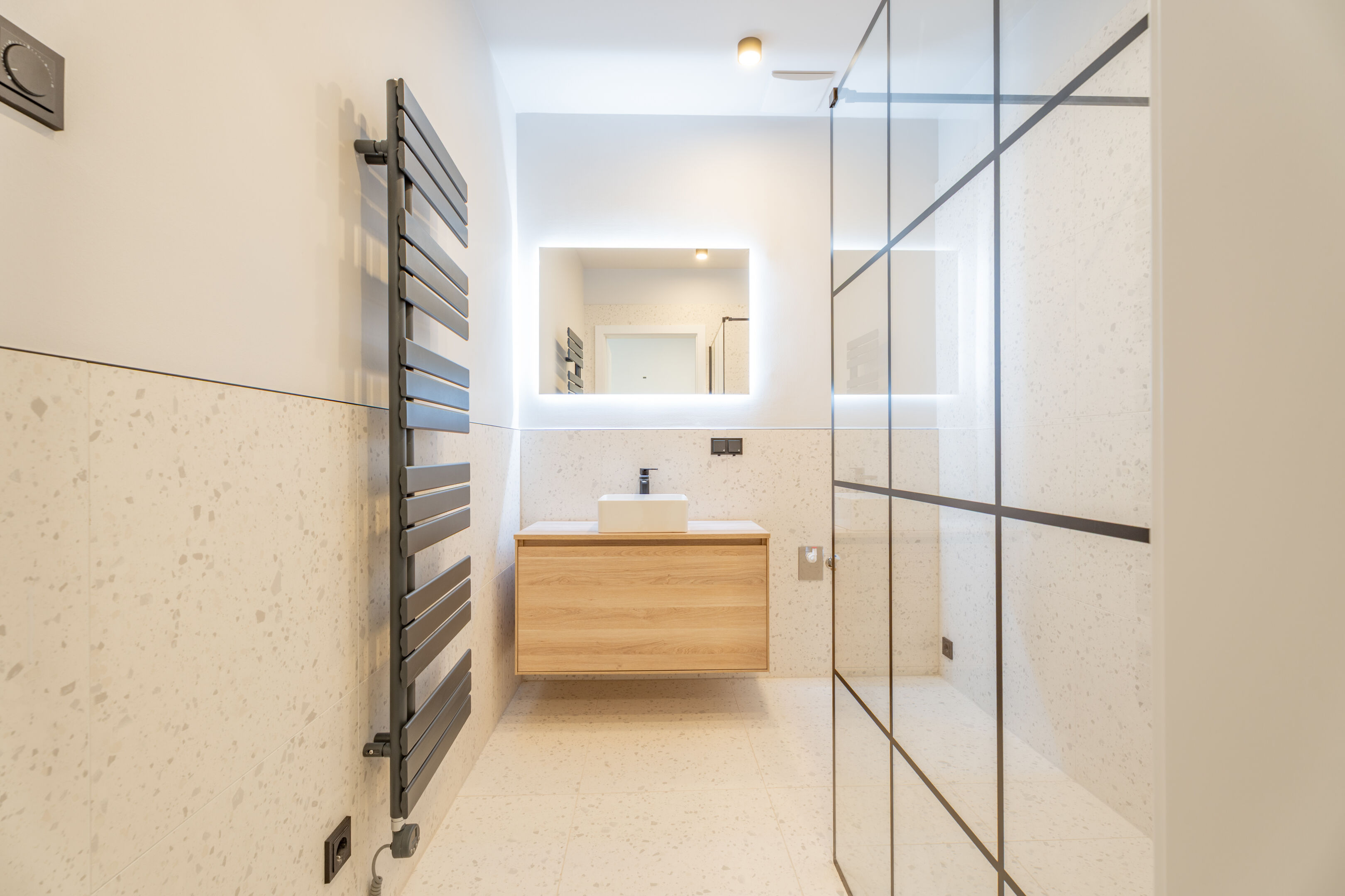 Über den einladenden Vorraum betreten Sie die großzügige Wohnküche mit ca. 29,5 m² – das Herzstück der Wohnung. Von hier aus gelangt man auf den ruhigen Balkon mit Blick ins Grüne. Das Schlafzimmer (ca. 18 m²) liegt zur Straßenseite und verfügt über ein elegantes Bad en suite. Das moderne Badezimmer ist mit einer bodengleichen Walk-In-Dusche, einem stilvollen Waschtisch samt Unterschrank und einem Handtuchheizkörper ausgestattet. Der Waschmaschinenanschluss ist ebenfalls integriert. Ein separates WC befindet sich direkt beim Wohnungseingang.