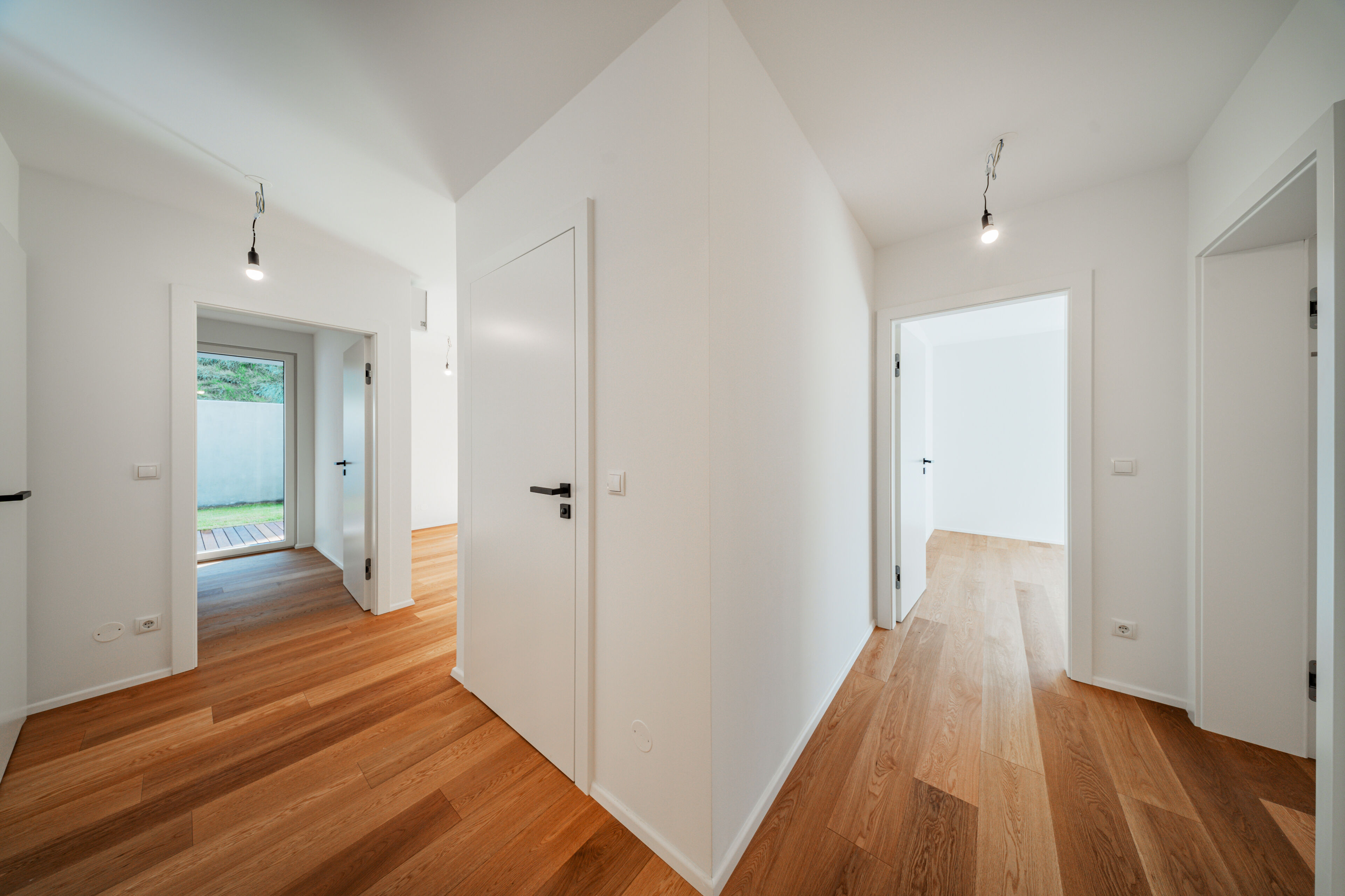 Diese hochwertig ausgestattete 4-Zimmer-Wohnung verfügt über rund 88 m² Wohnfläche mit einer zweiseitig angrenzenden ca. 42m² Terrasse und einem ca. 111m² großen Garten. Sie besticht durch ihren durchdachten Grundriss und teilt sich wie folgt auf: