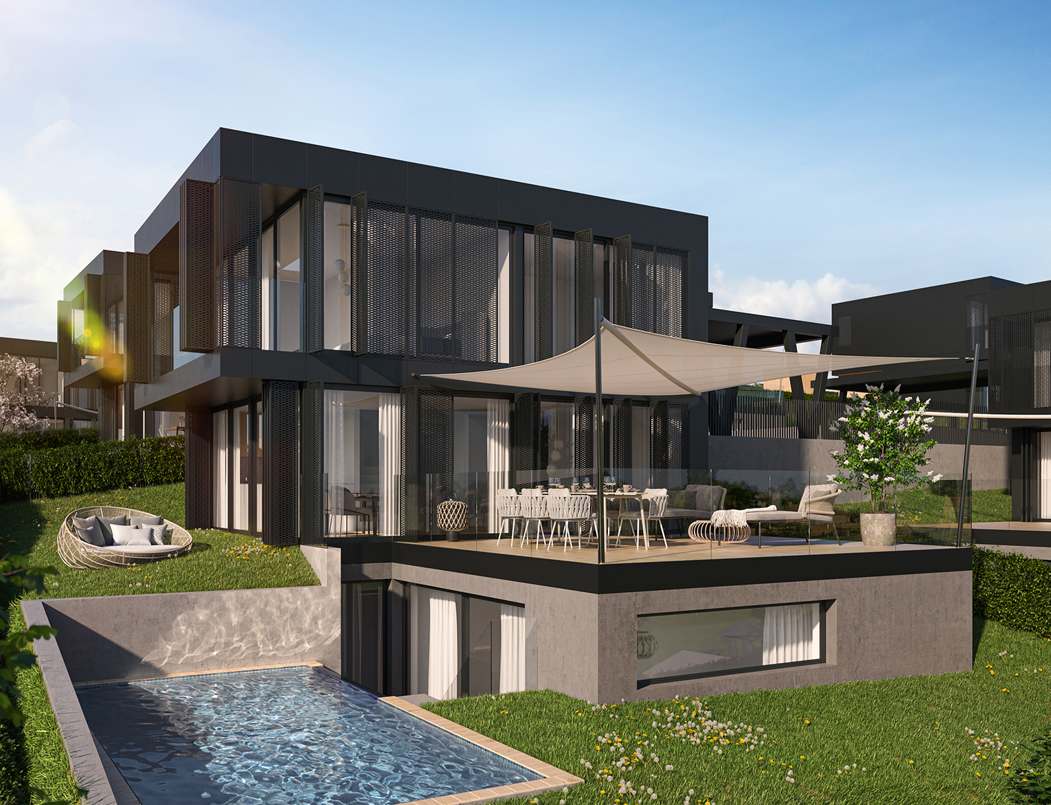 Die an den Bauhausstil Walter Gropius‘ erinnernden Kuben werden optisch im Besonderen durch edle Paneele aus Faserzement bereichert, die sich als stilprägendes Element über die Fassaden ziehen und dabei Funktionalität mit Ästhetik auf wunderbare Art und Weise verbinden. Durch die flexible Verkleidung der Villen ist nicht nur der Schutz vor Wind und Wetter garantiert, sie kreiert auch facettenreiche Lichtkonzepte im Inneren der Häuser.