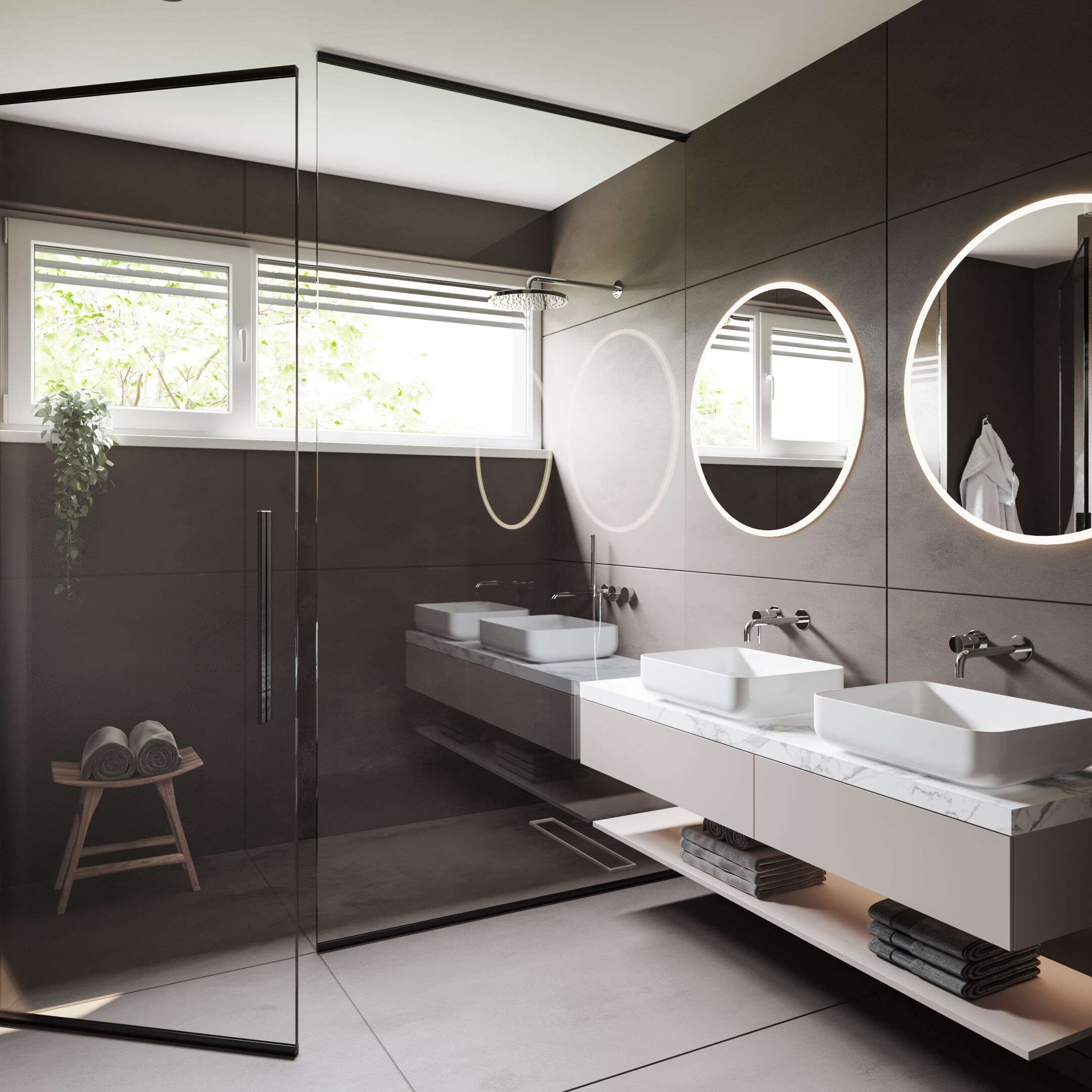 - Large format tiles (60x60, 80x80, 60x120 cm) in wet rooms
