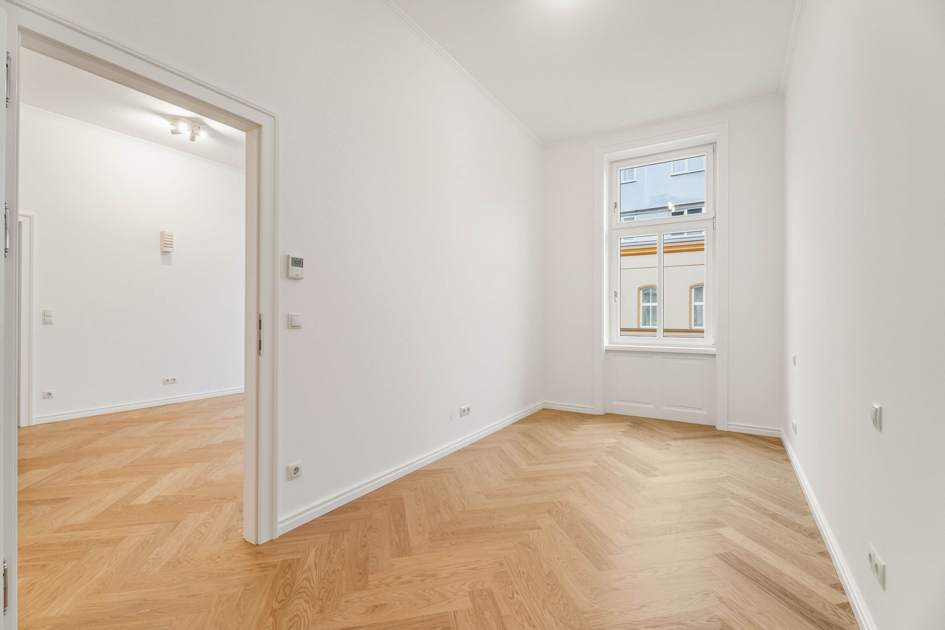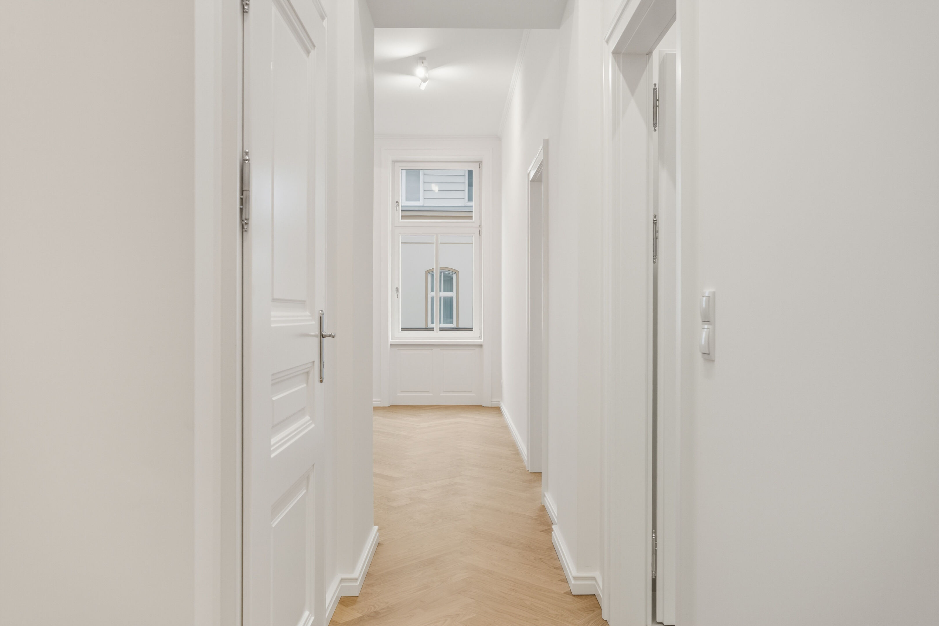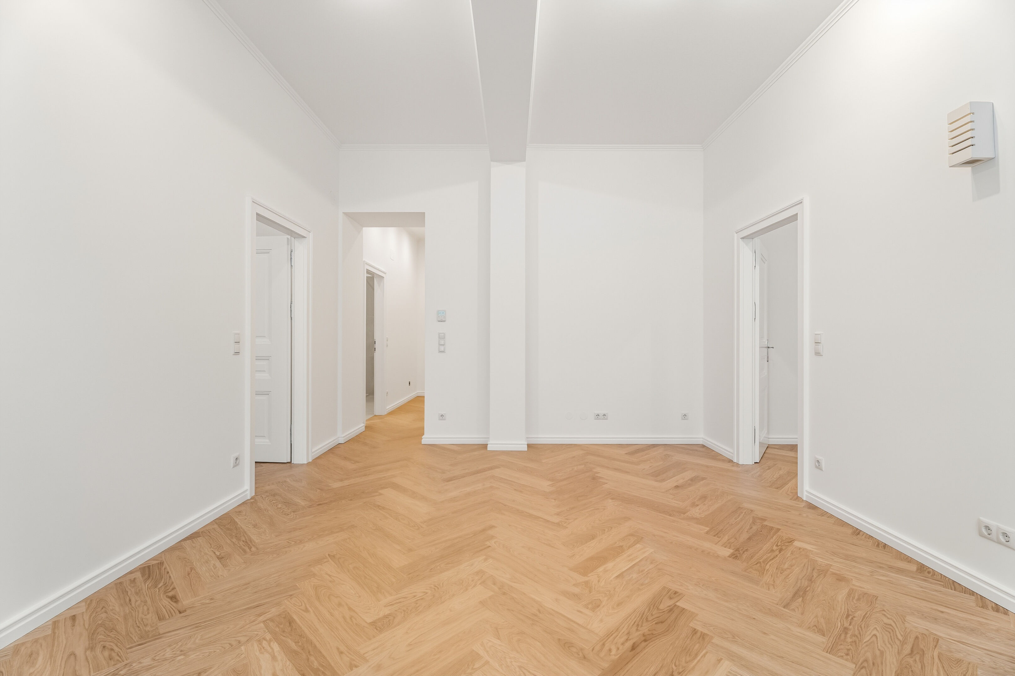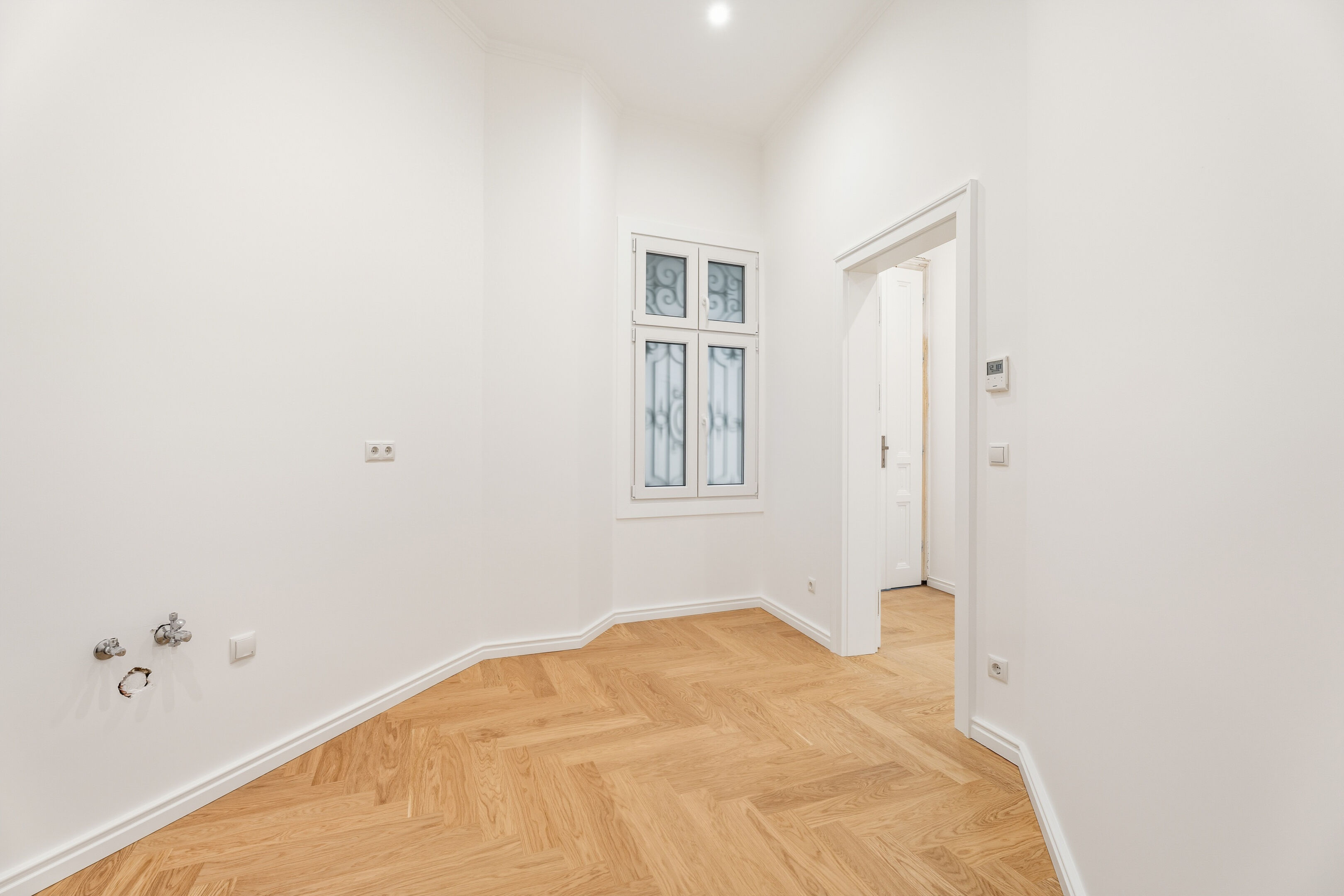 The flat presents itself as a first-time occupancy after top refurbishment with high-quality oak herringbone parquet flooring, classic old building doors and beautifully refurbished old building windows, which gives the rooms a stylish ambience and emphasises the timeless character of the house.