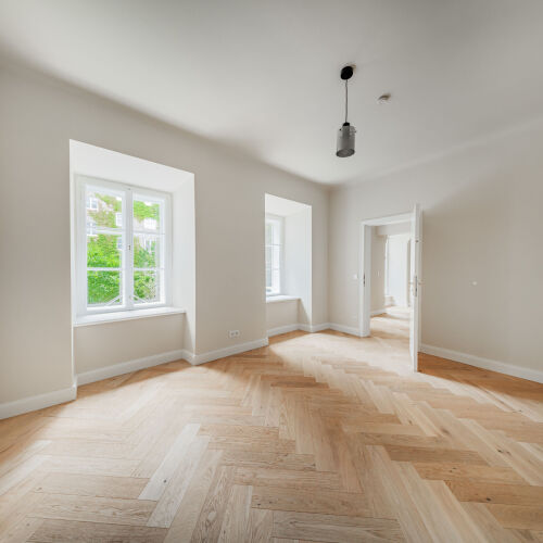 High doors and large windows emphasise the classic old Viennese character, while the imposing ceiling heights create a feeling of spaciousness and lend the rooms an extraordinary generosity. Two flats on each floor have balconies that open onto the quiet, leafy inner courtyard and offer private retreats in the centre of the city.