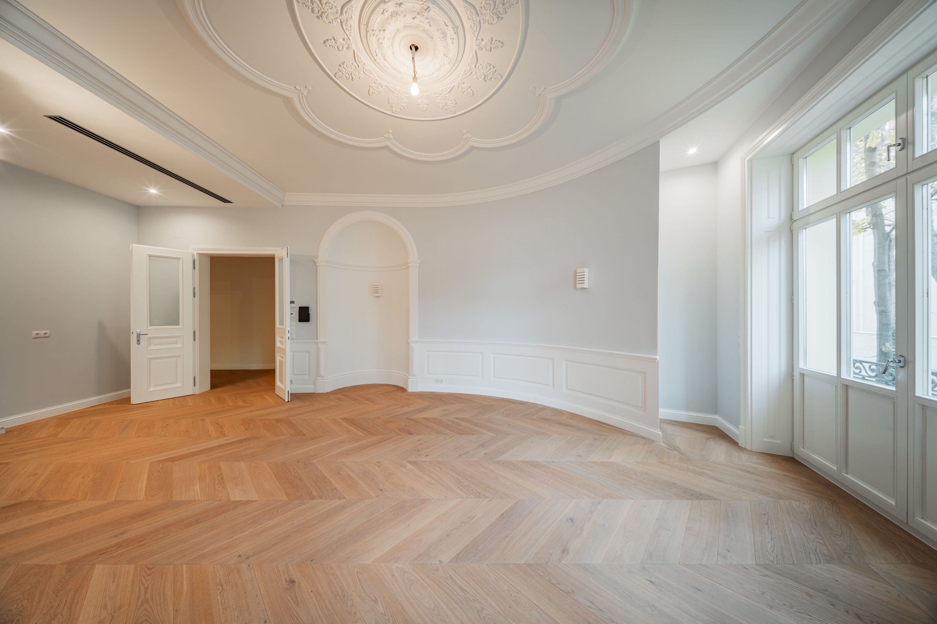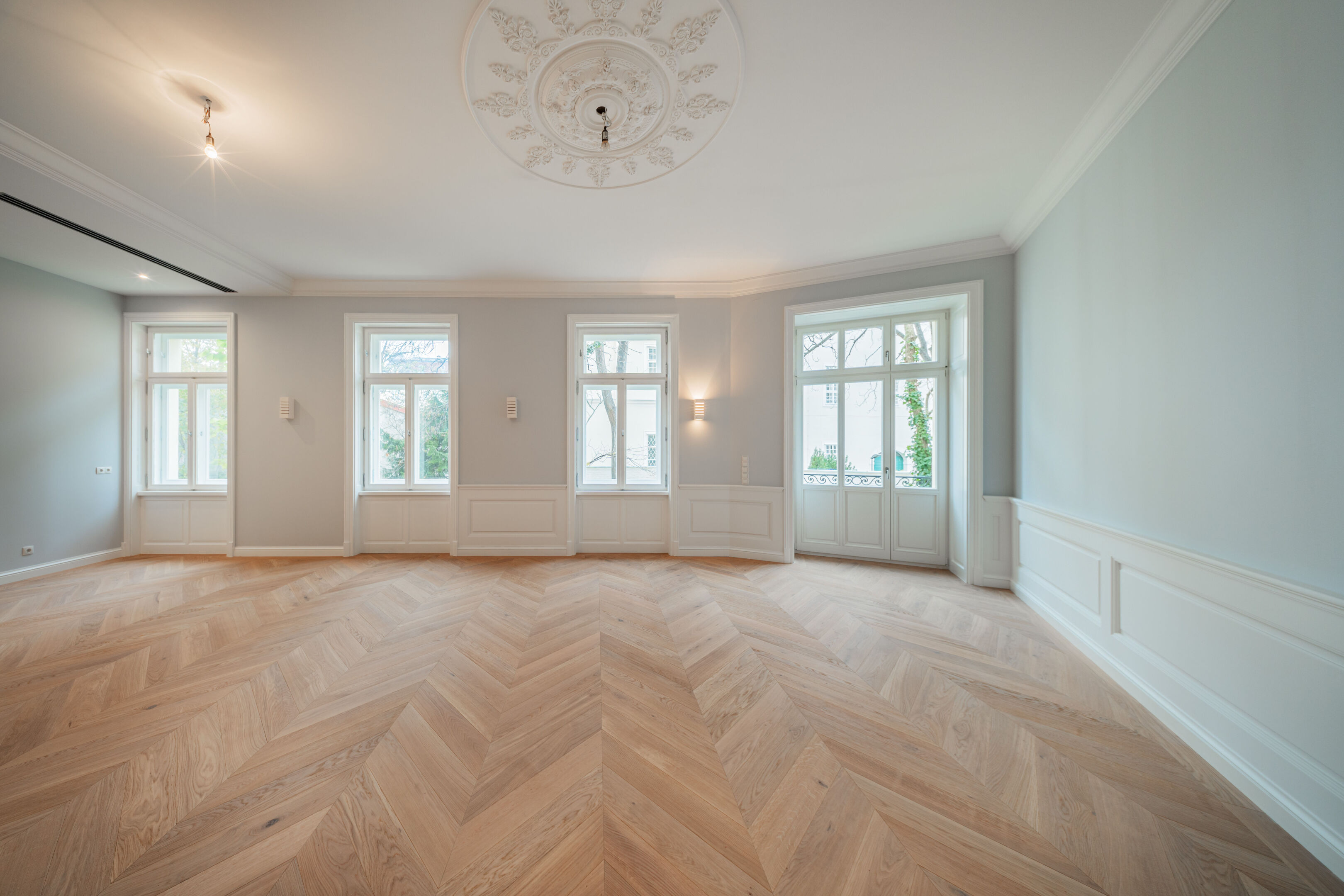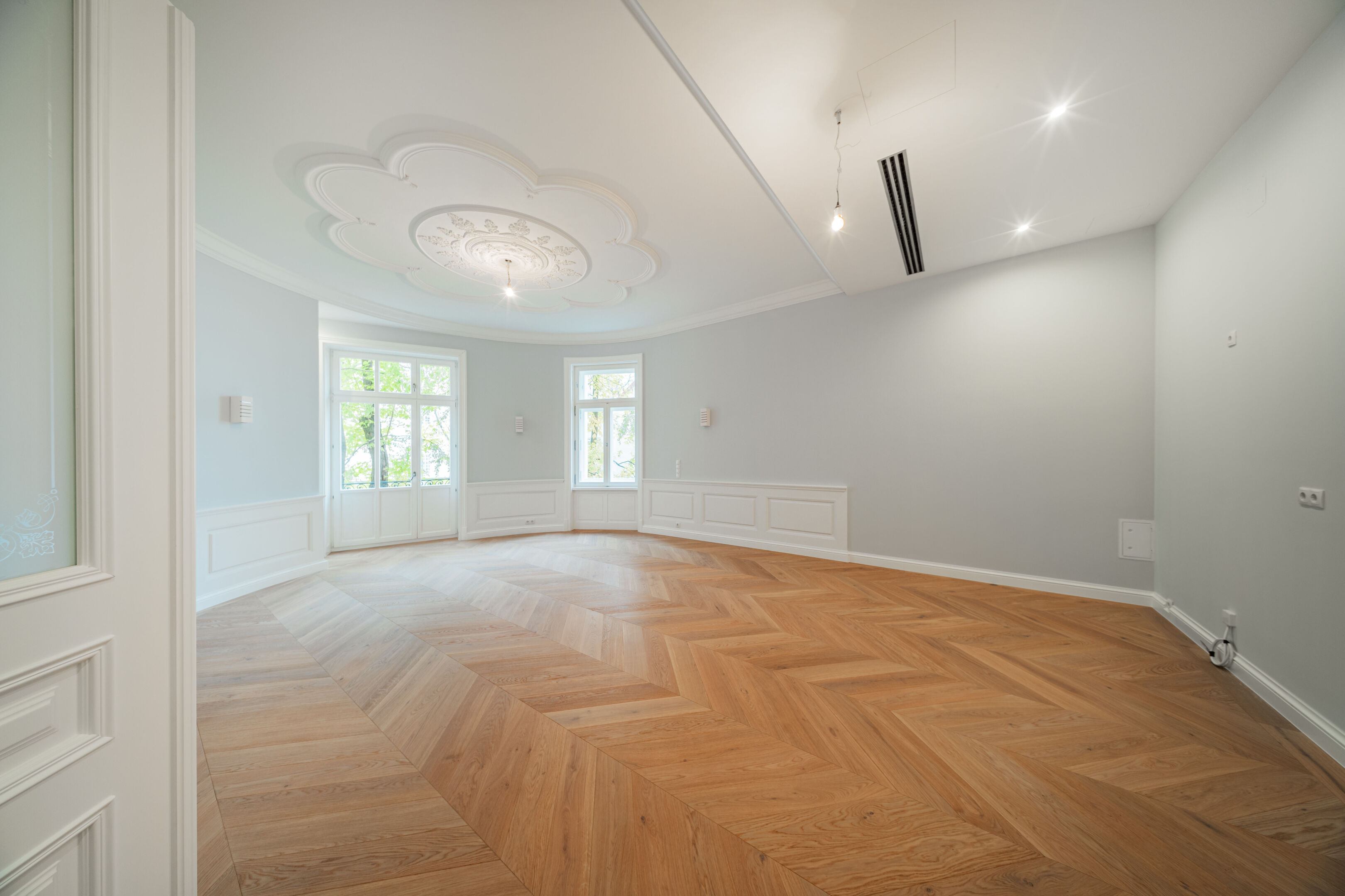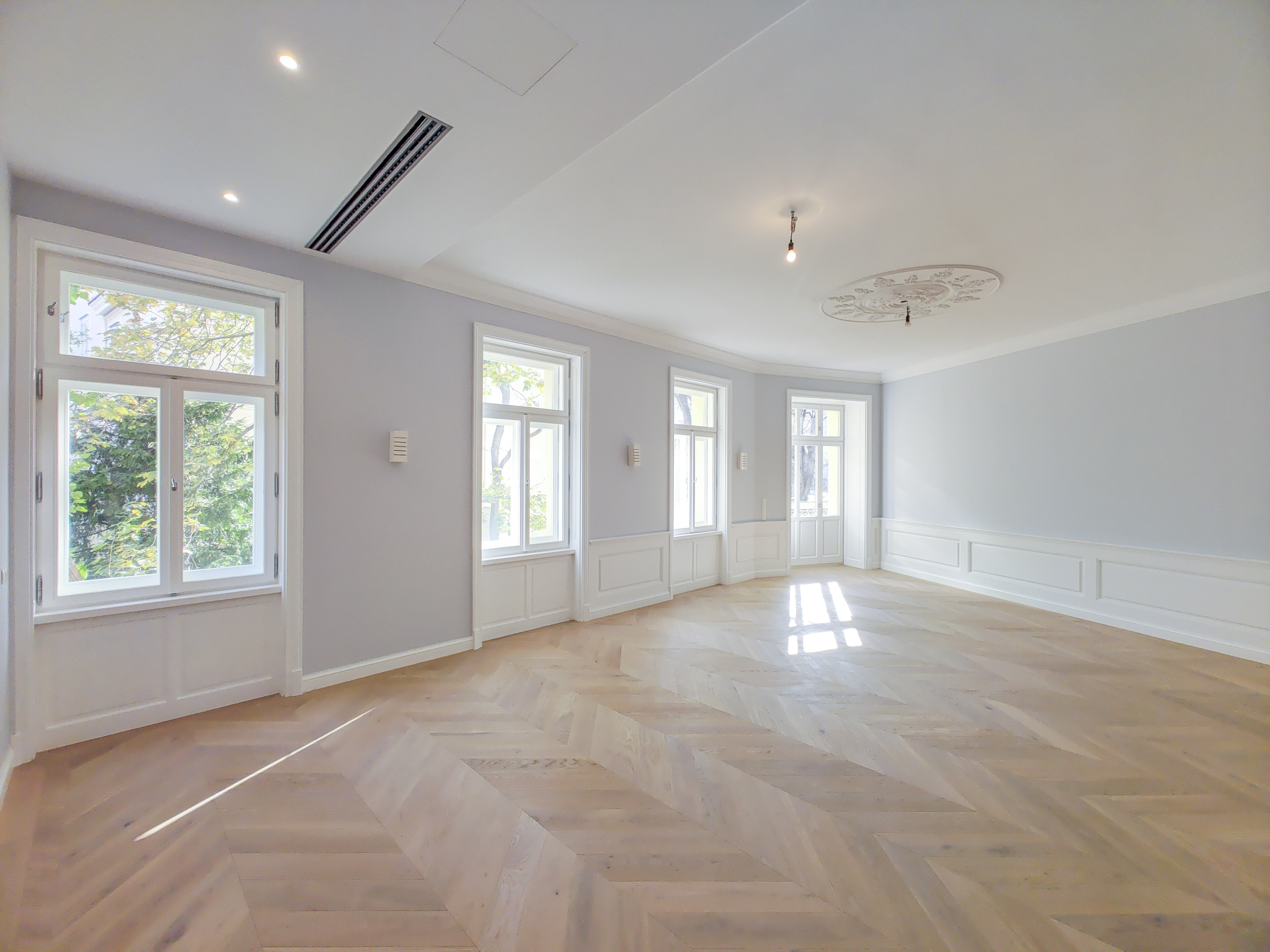 - French herringbone parquet flooring, magnificent stucco mouldings, traditional box-type windows with reveals, high doors in old Viennese style