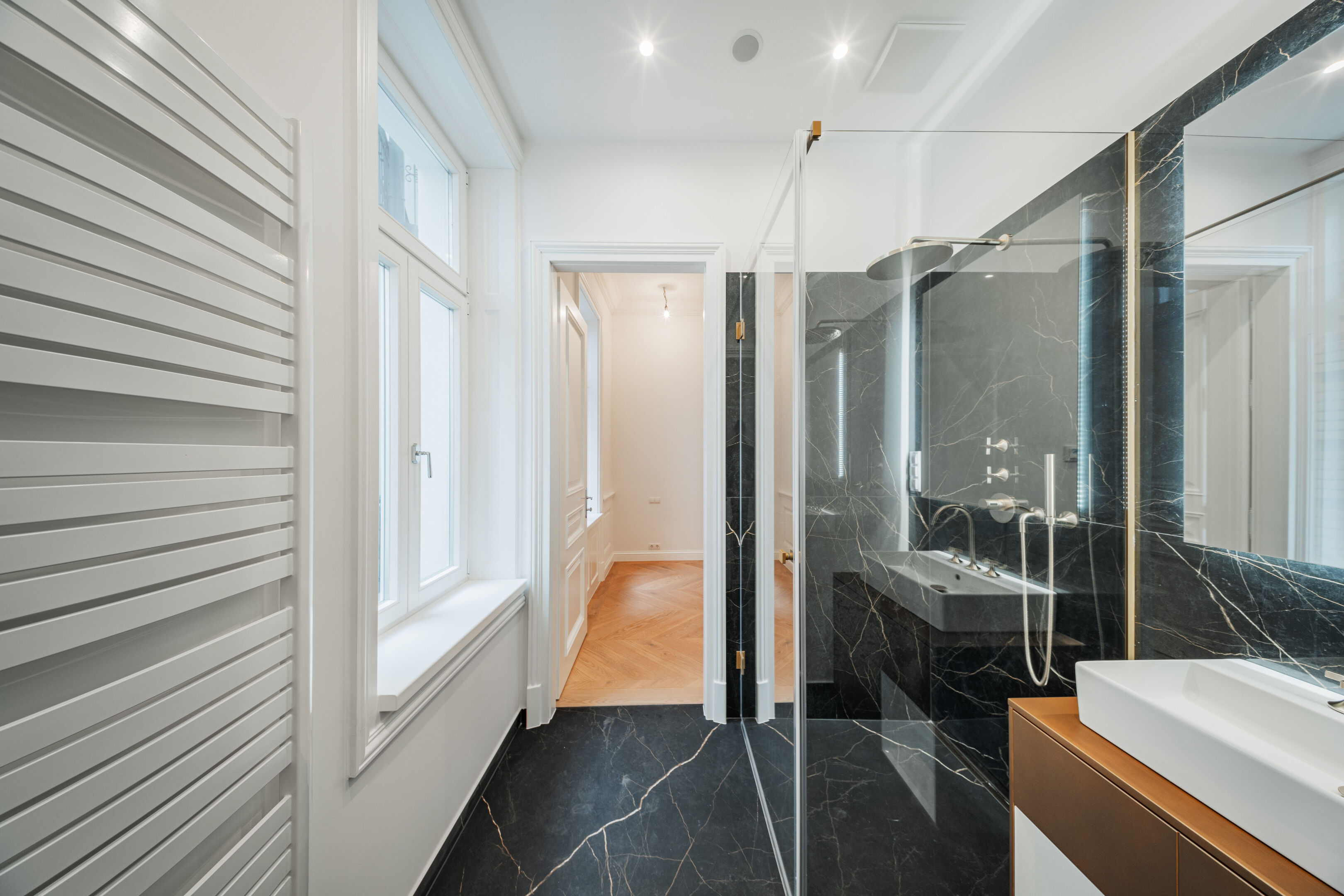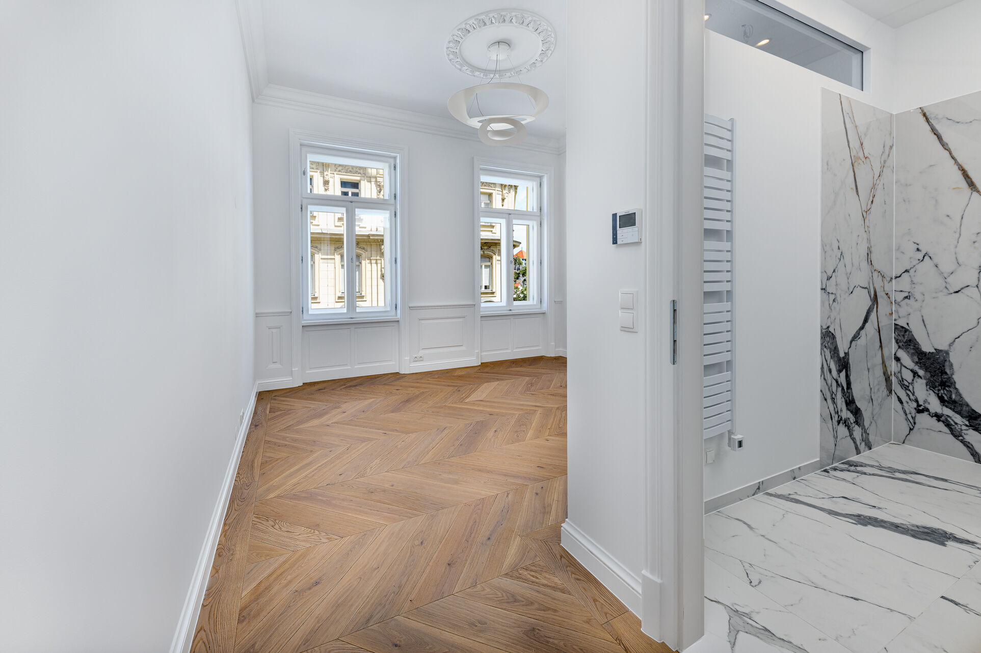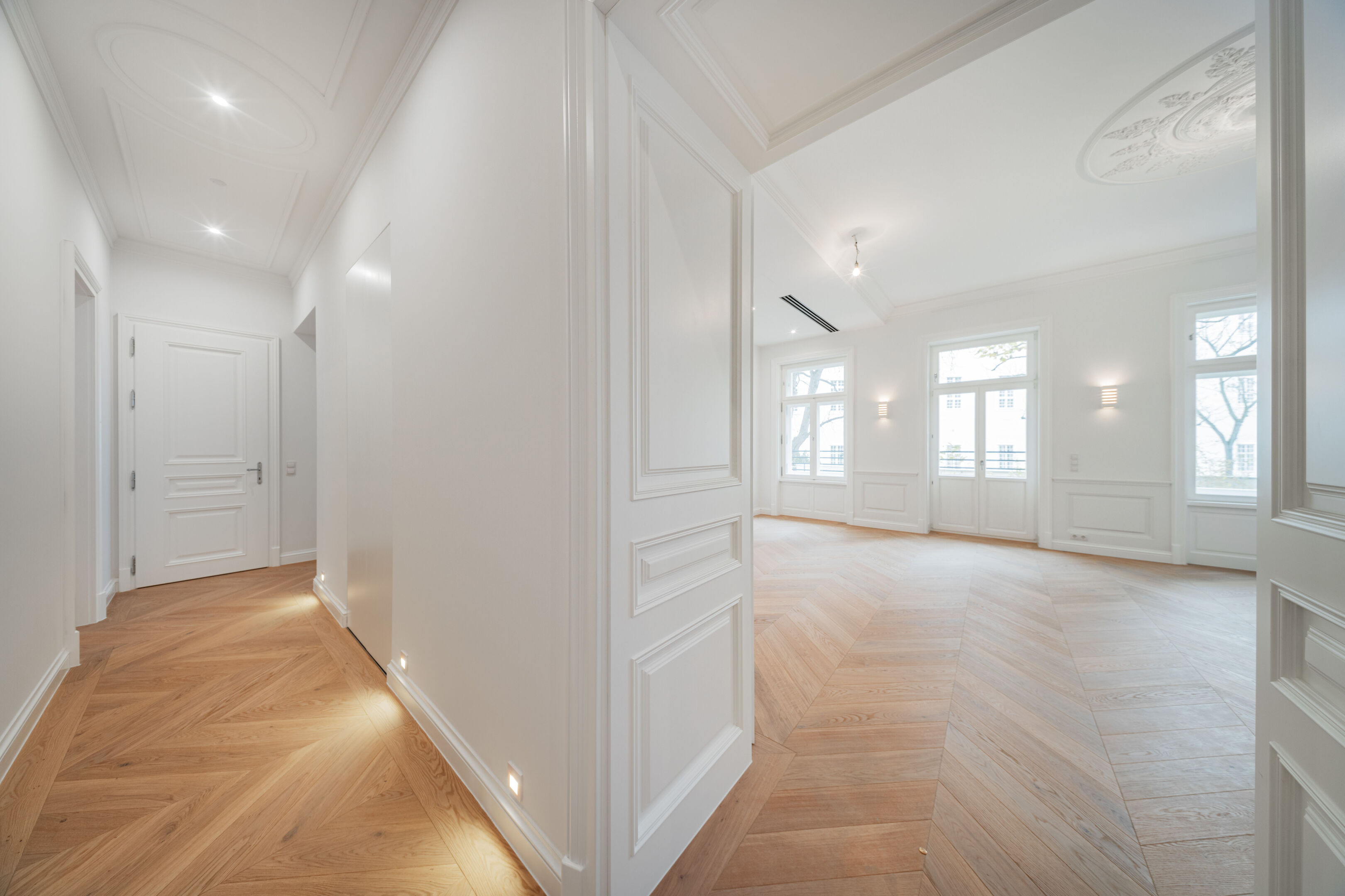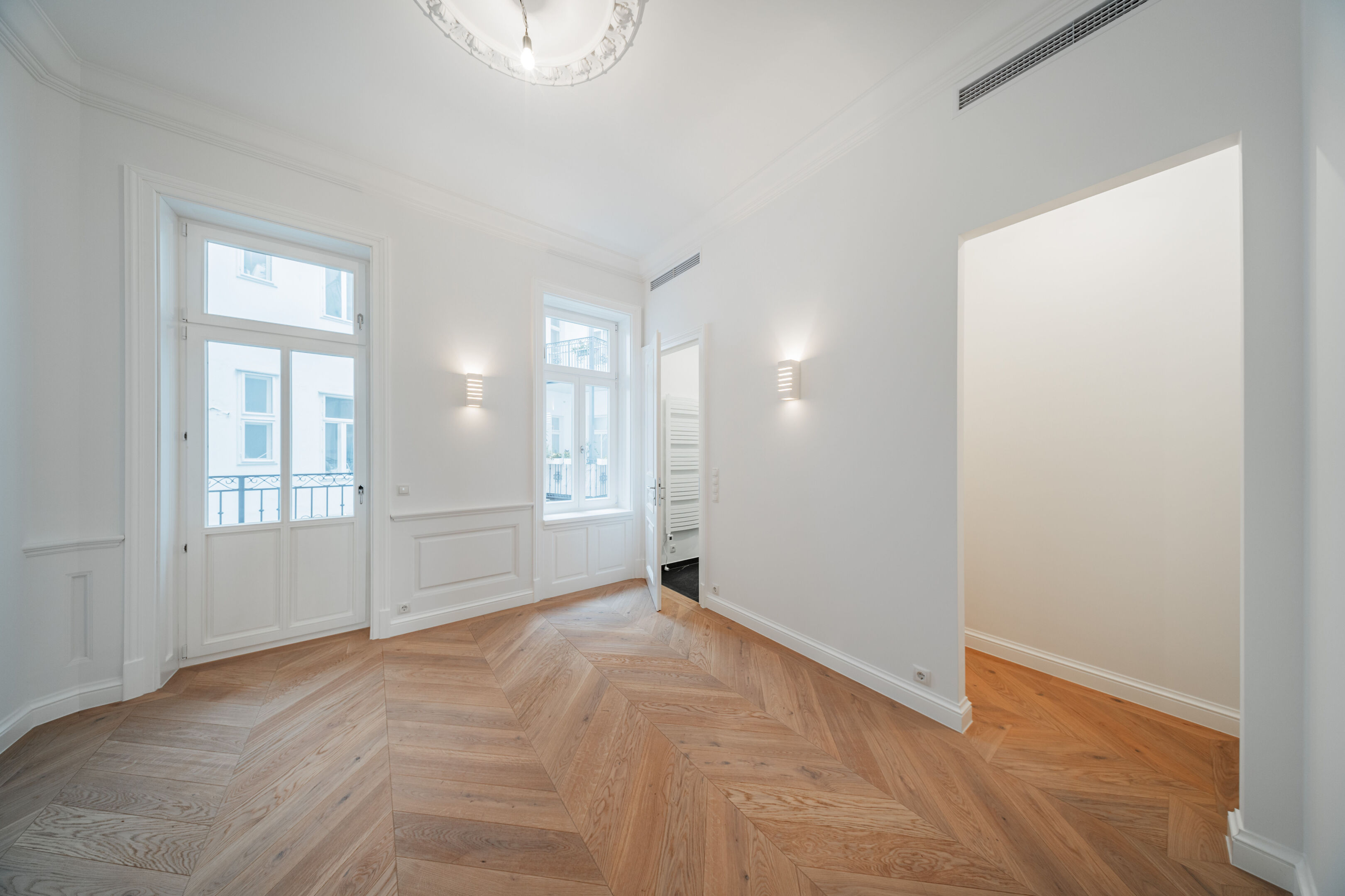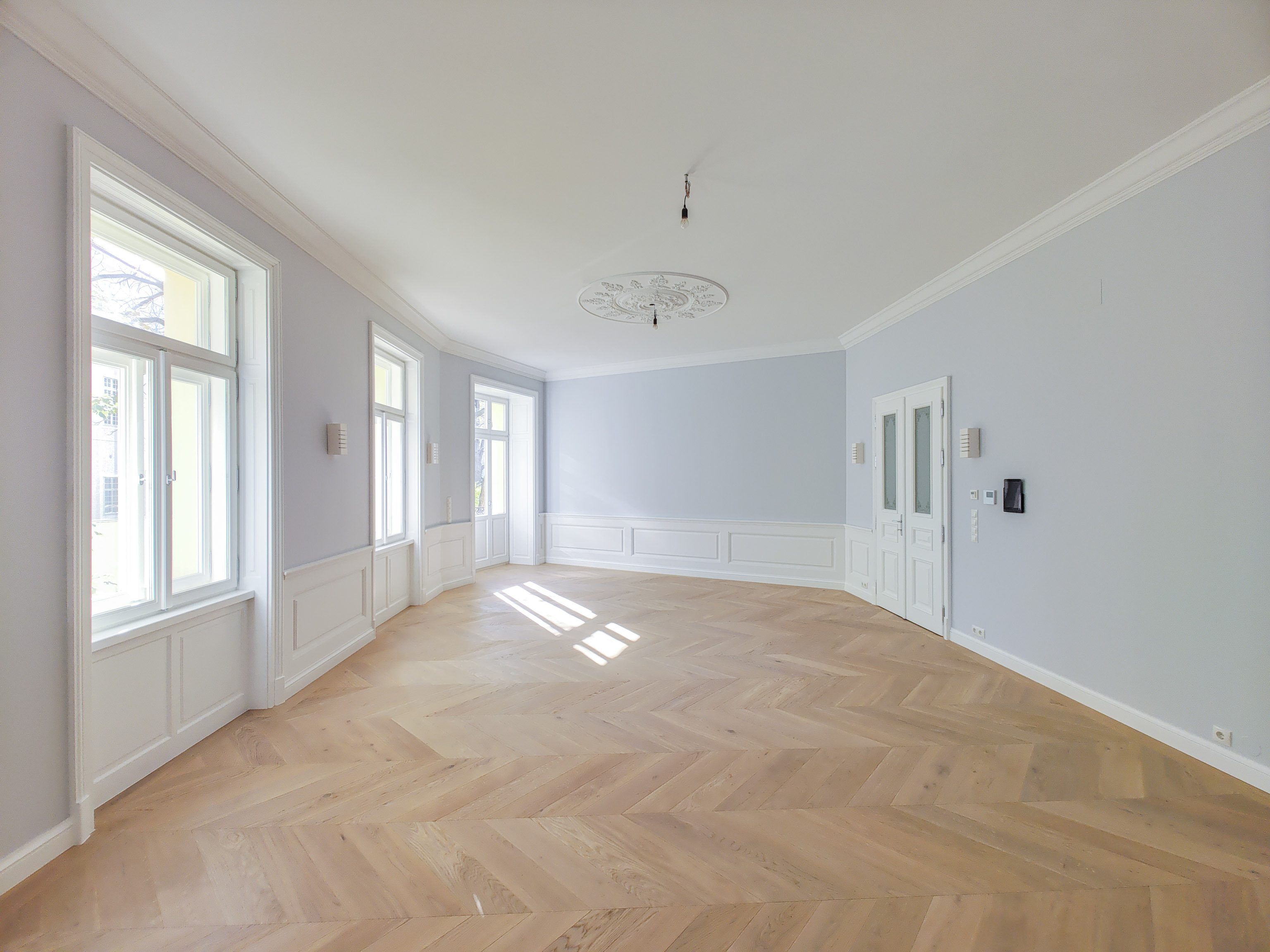- French herringbone parquet flooring, magnificent stucco mouldings, traditional box-type windows with reveals, high doors in old Viennese style