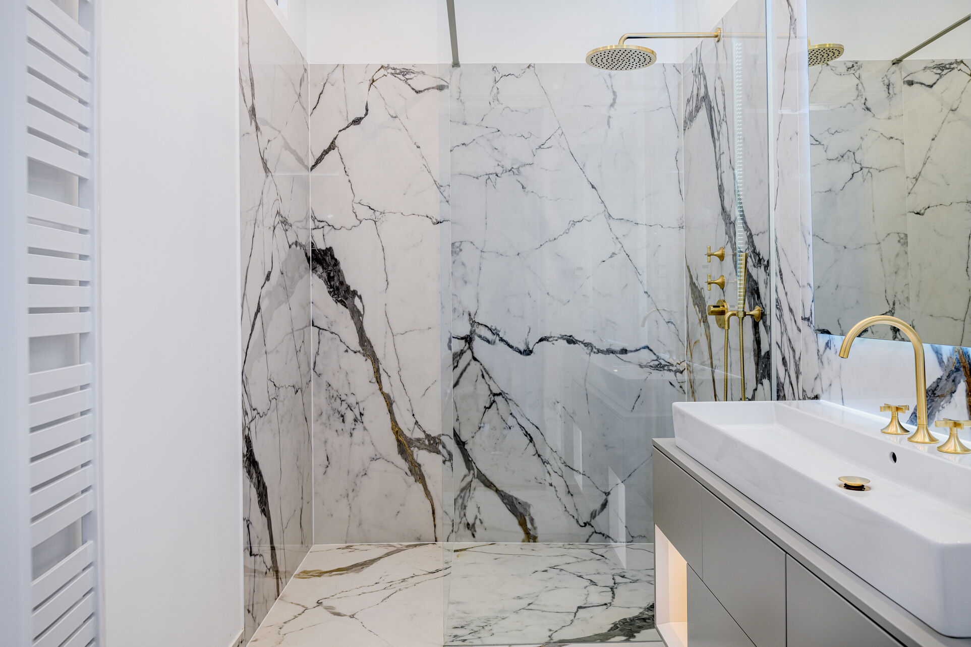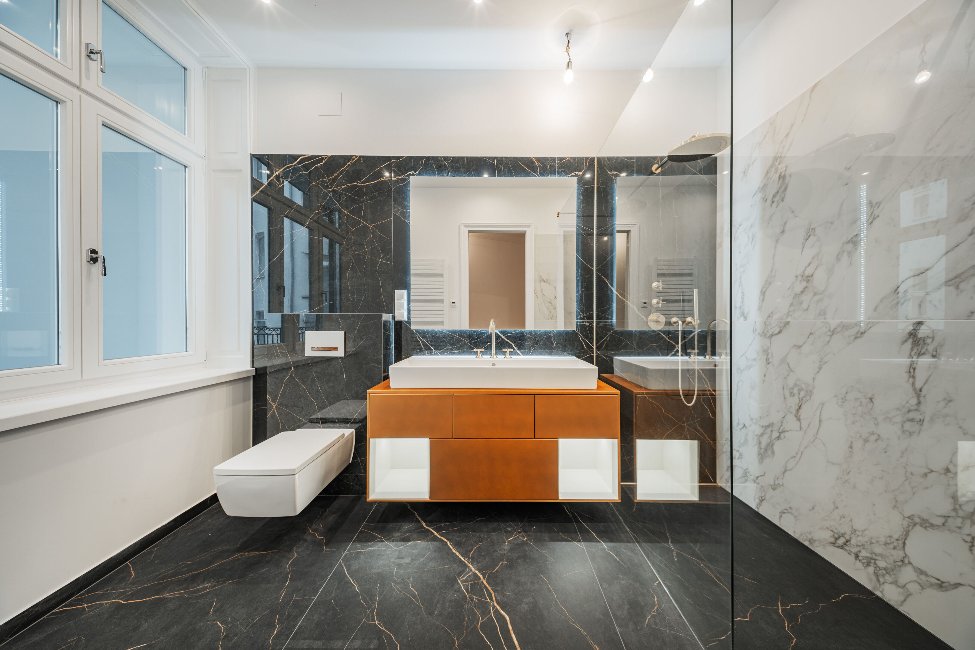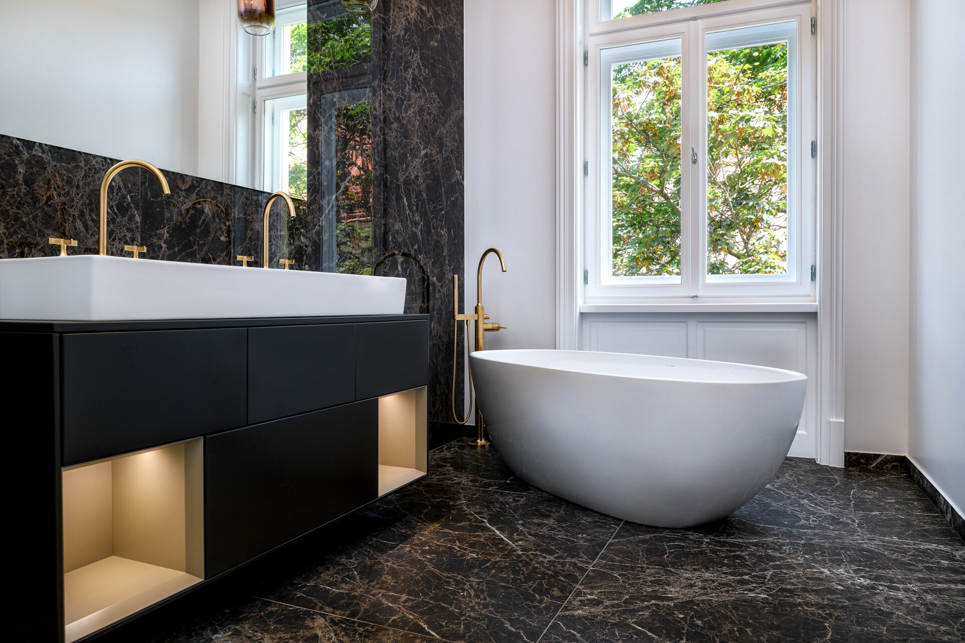 - Exclusive bathrooms with free-standing bathtub, double washbasins, branded fittings and marble-look porcelain stoneware