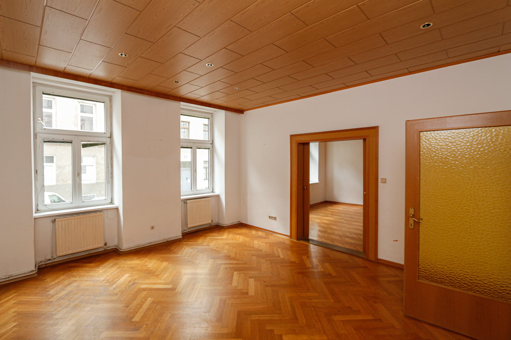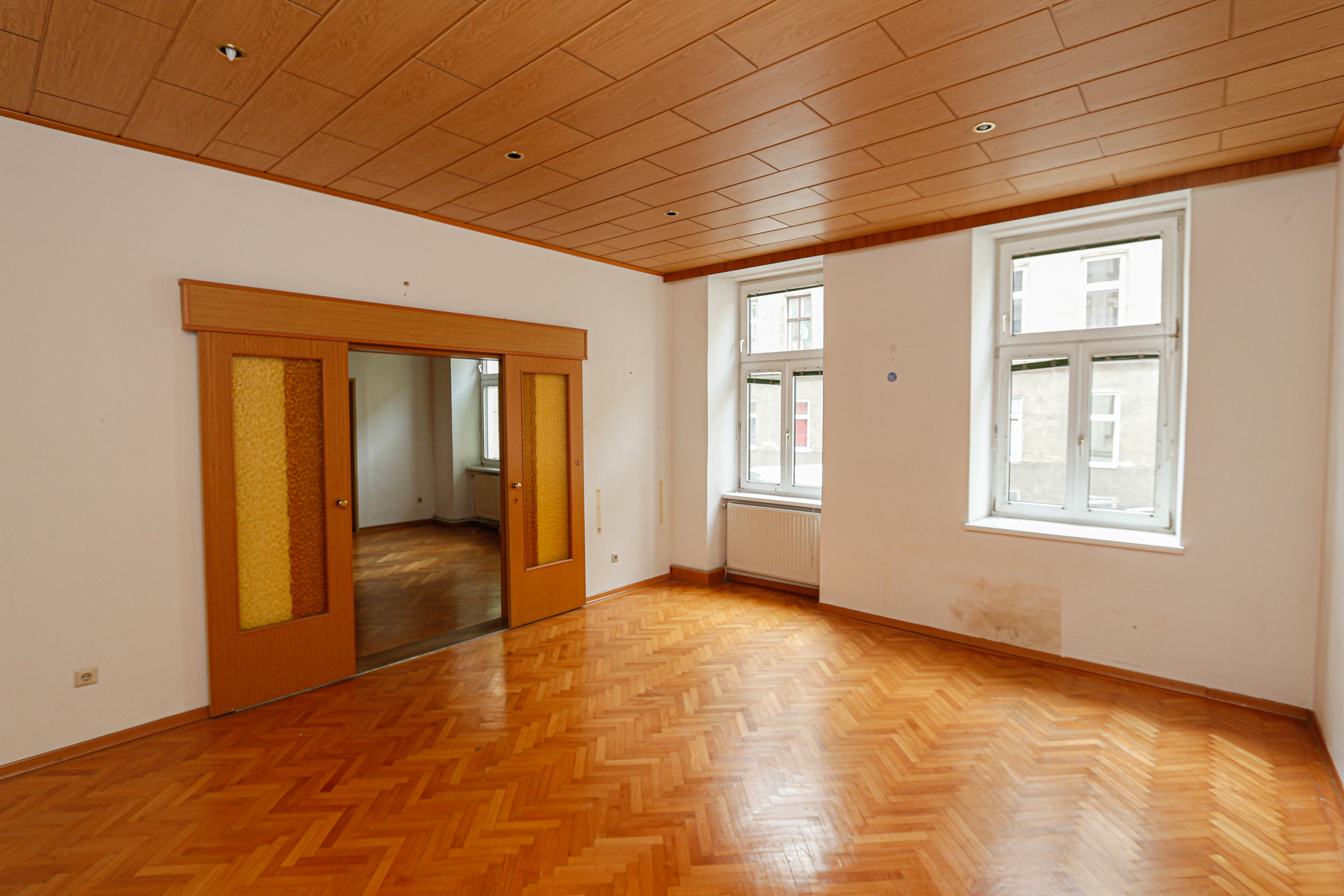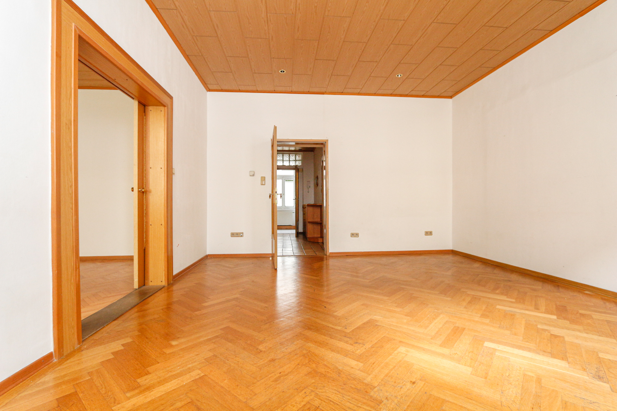 This spacious flat is located on the mezzanine floor of a well-kept old building. It has a living room, a kitchen, two bedrooms, a bathroom with bath and shower, a WC and a spacious entrance hall. The property impresses with its perfect floor plan and its brightness. The property is perfect for singles, students, couples and is ready for immediate occupancy.