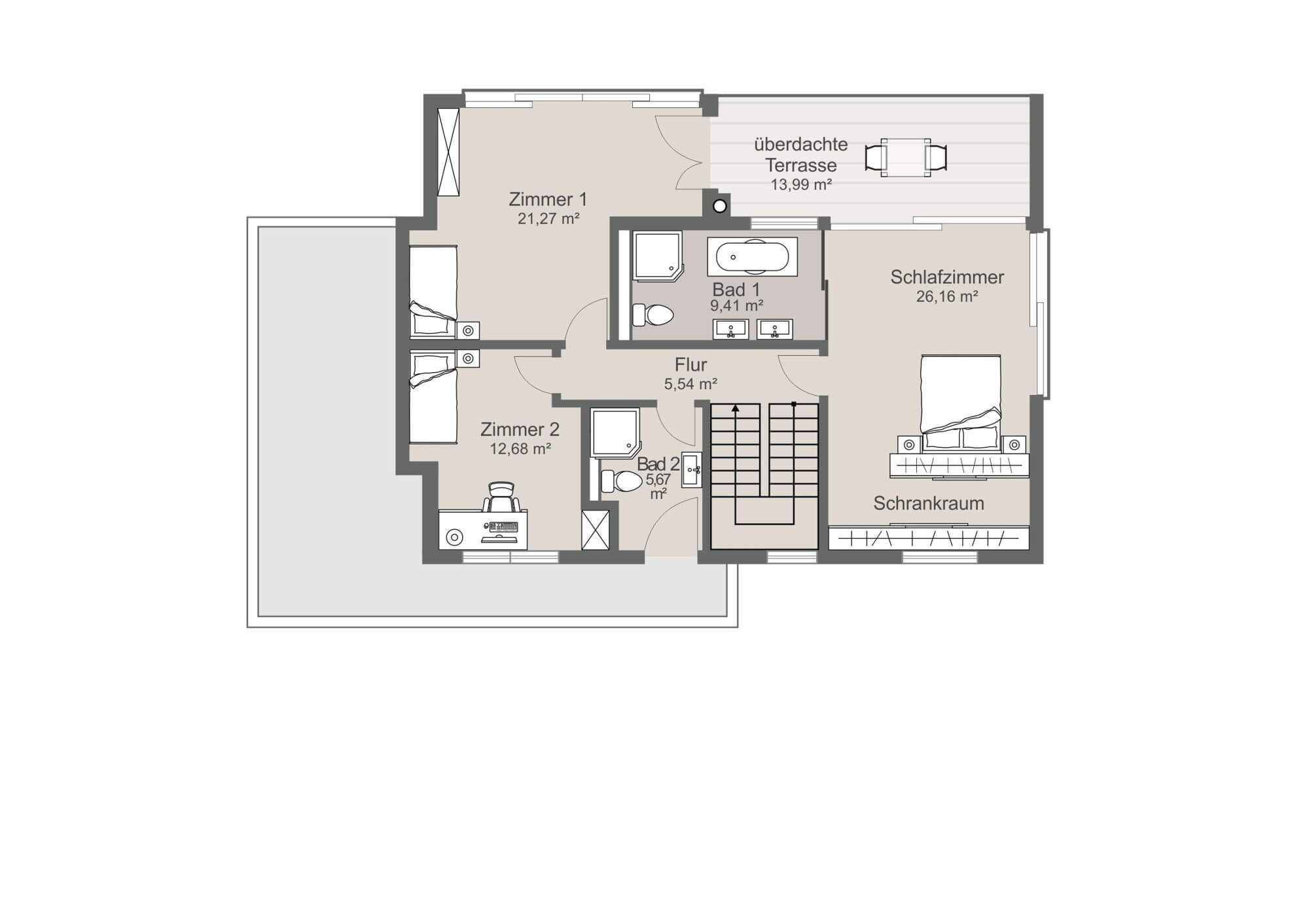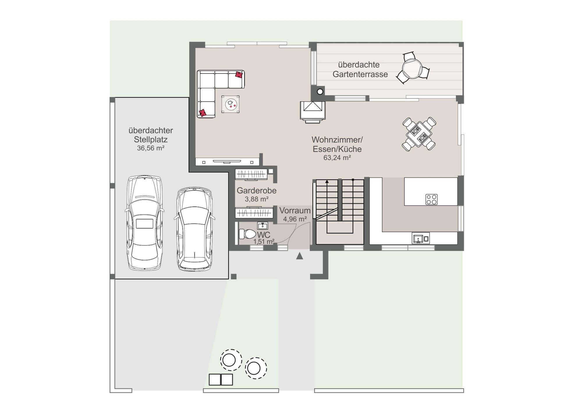 Spacious foyer with cloakroom, guest WC, open-plan living room (approx. 63 m²) with modern kitchen and direct access to the sun terrace.