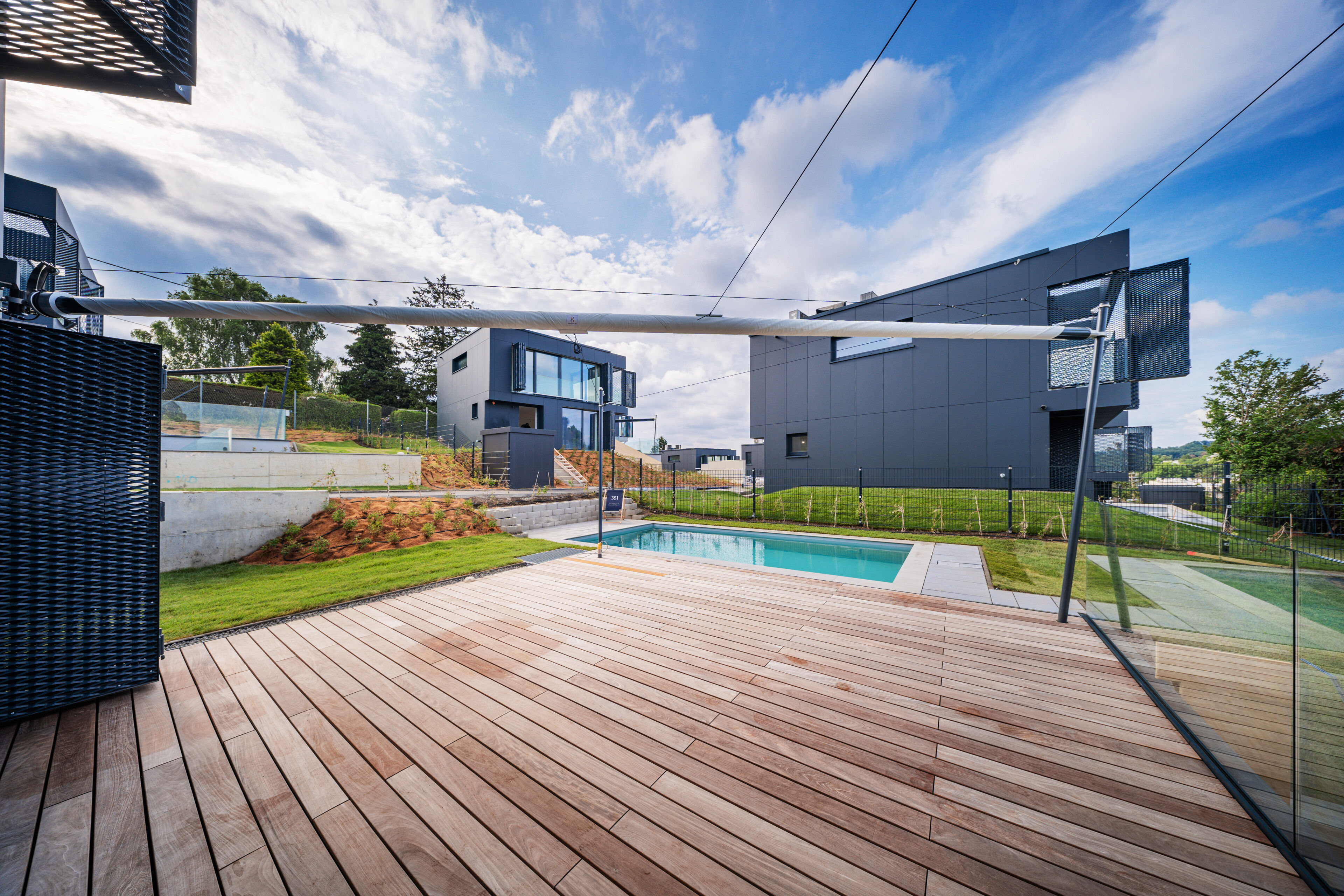 - Lower floor: bedroom, bathroom with shower, bath and WC, sauna, relaxation area with shower, utility room, WC, access to the pool and 192 m² garden