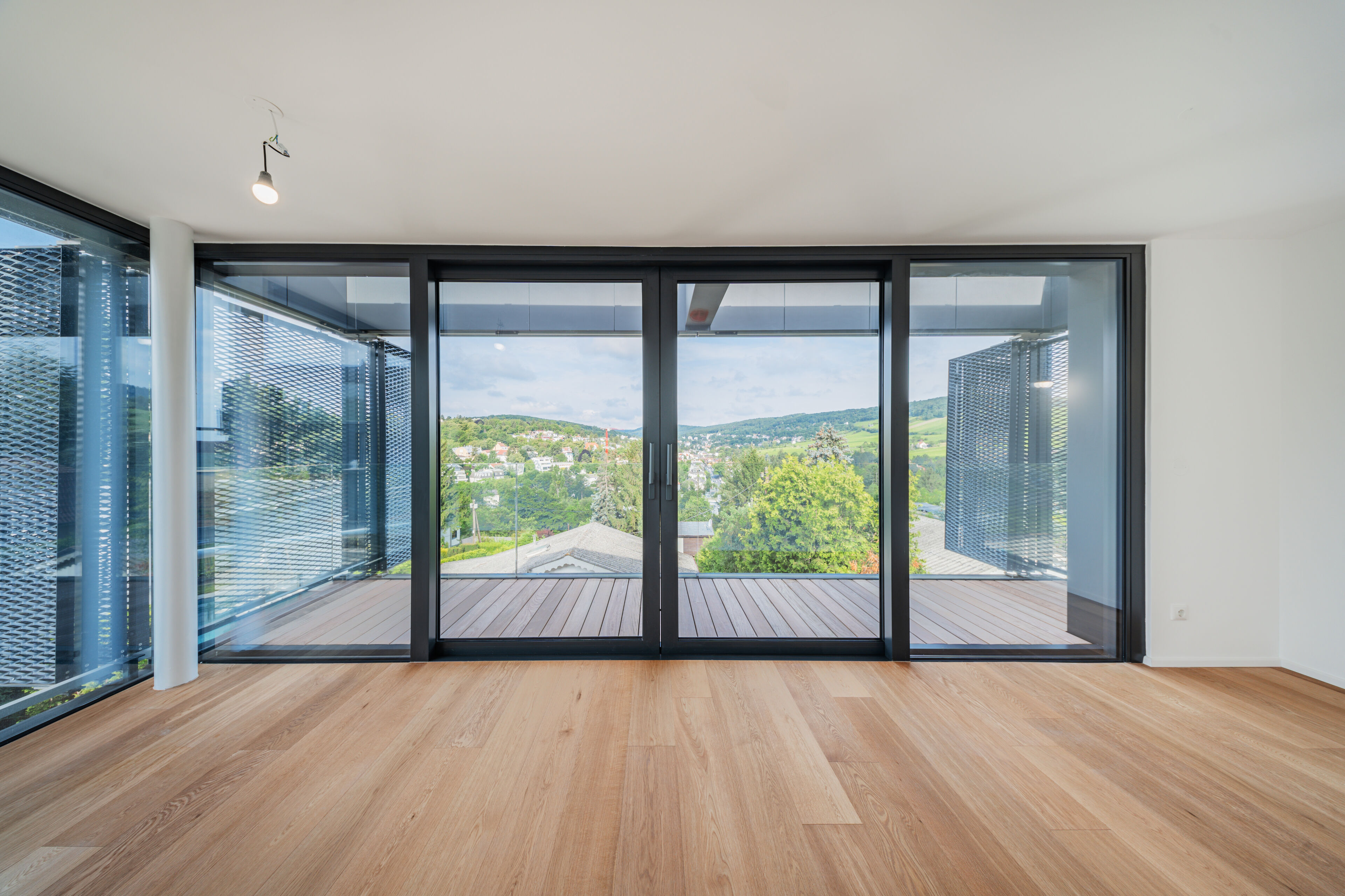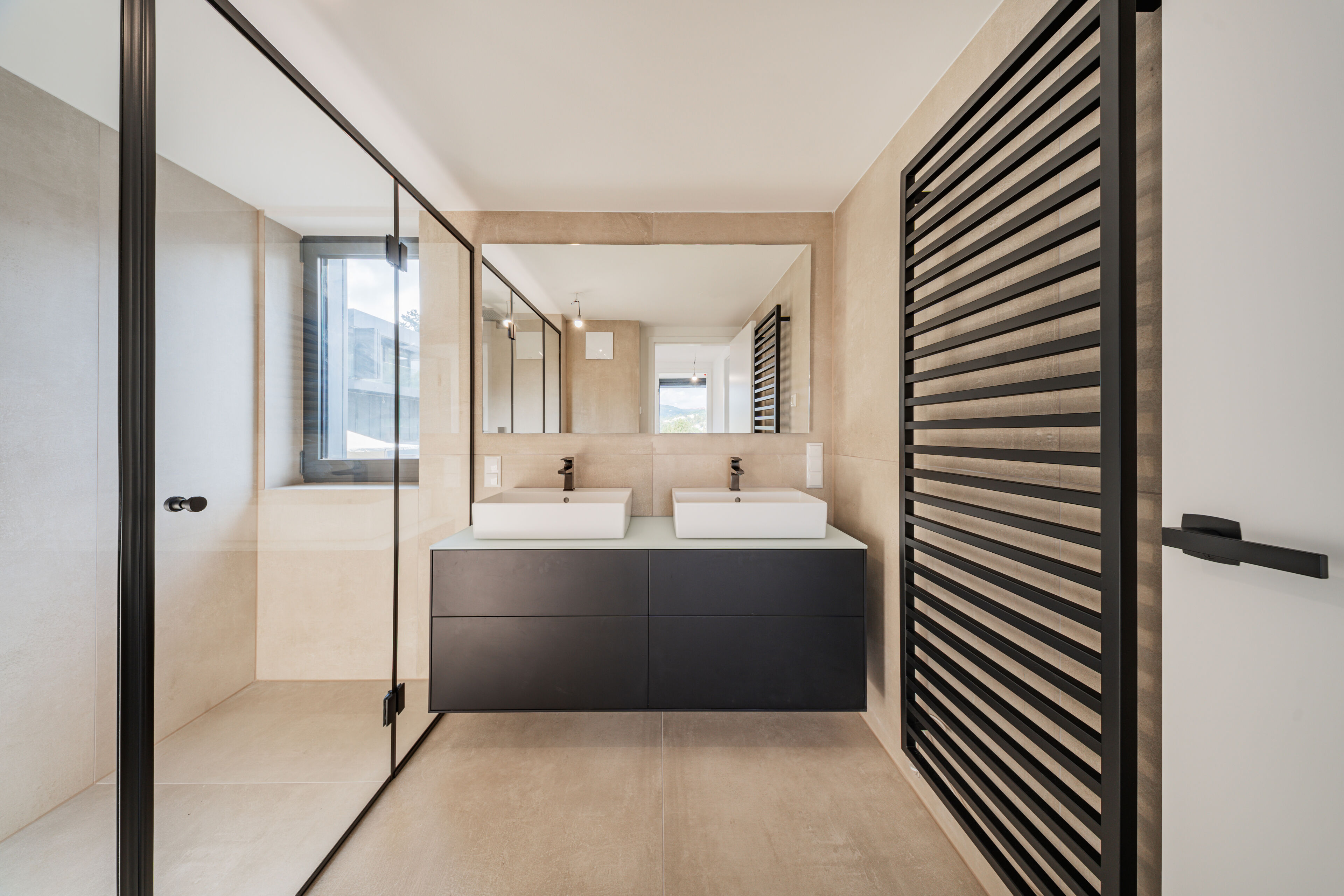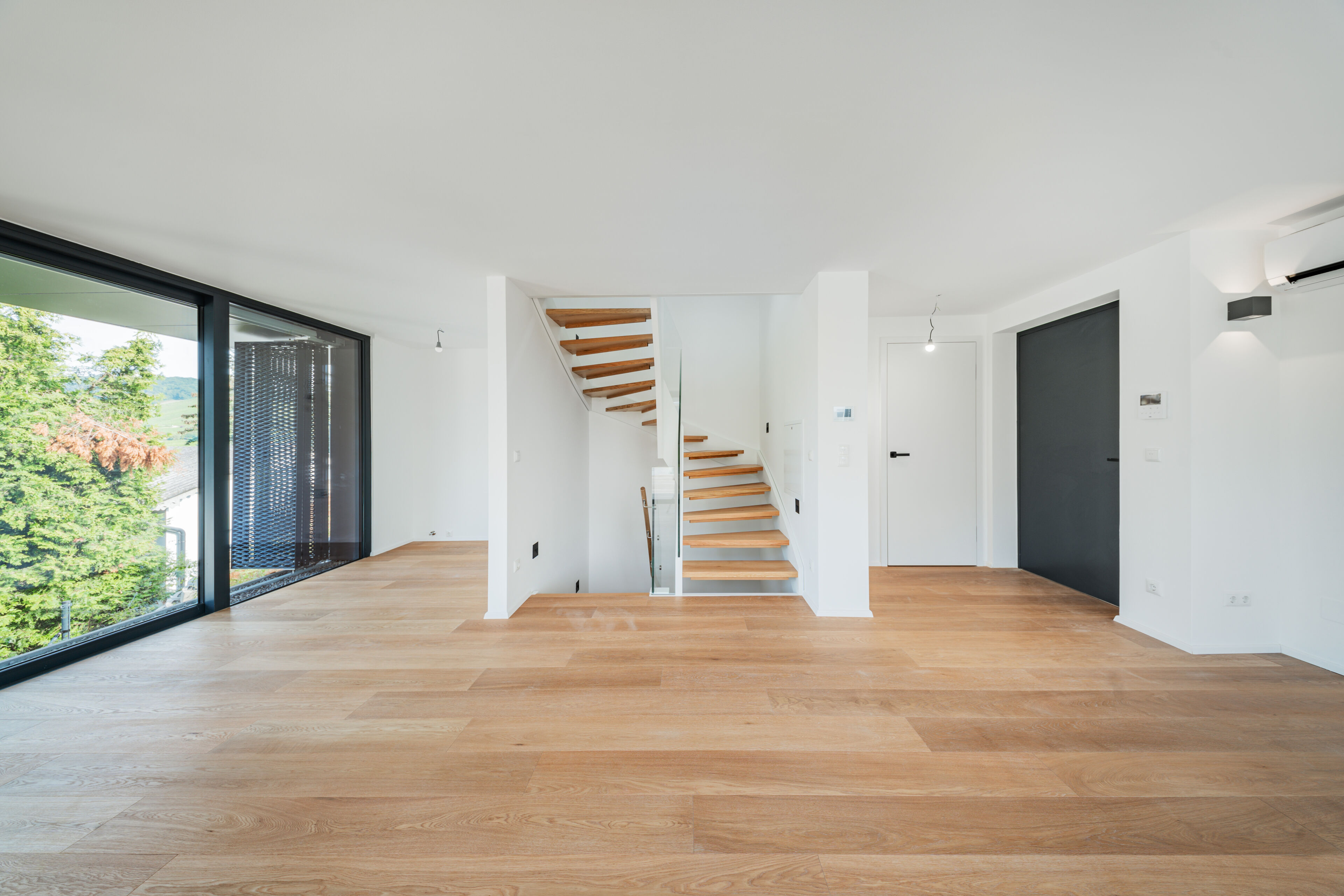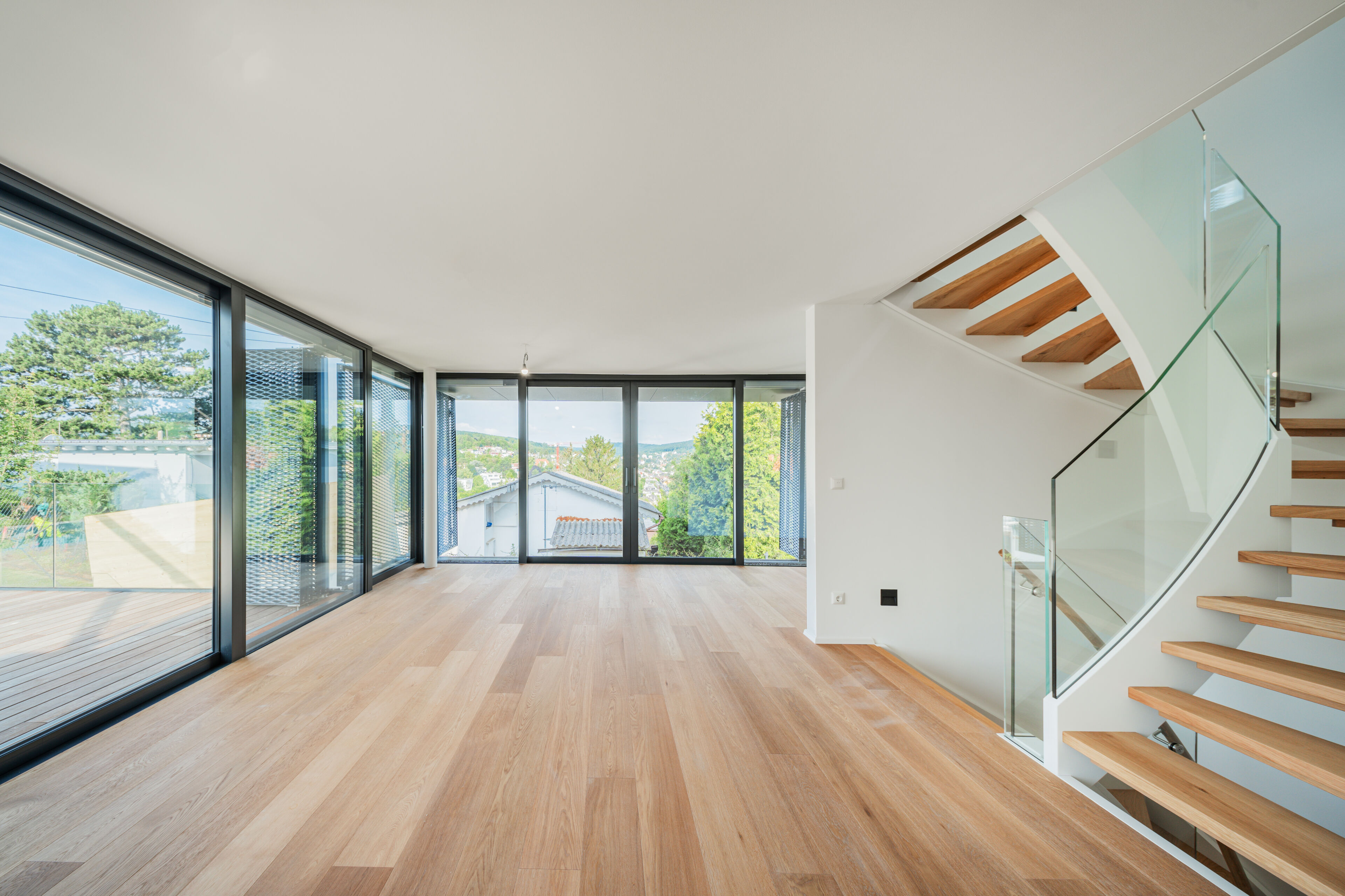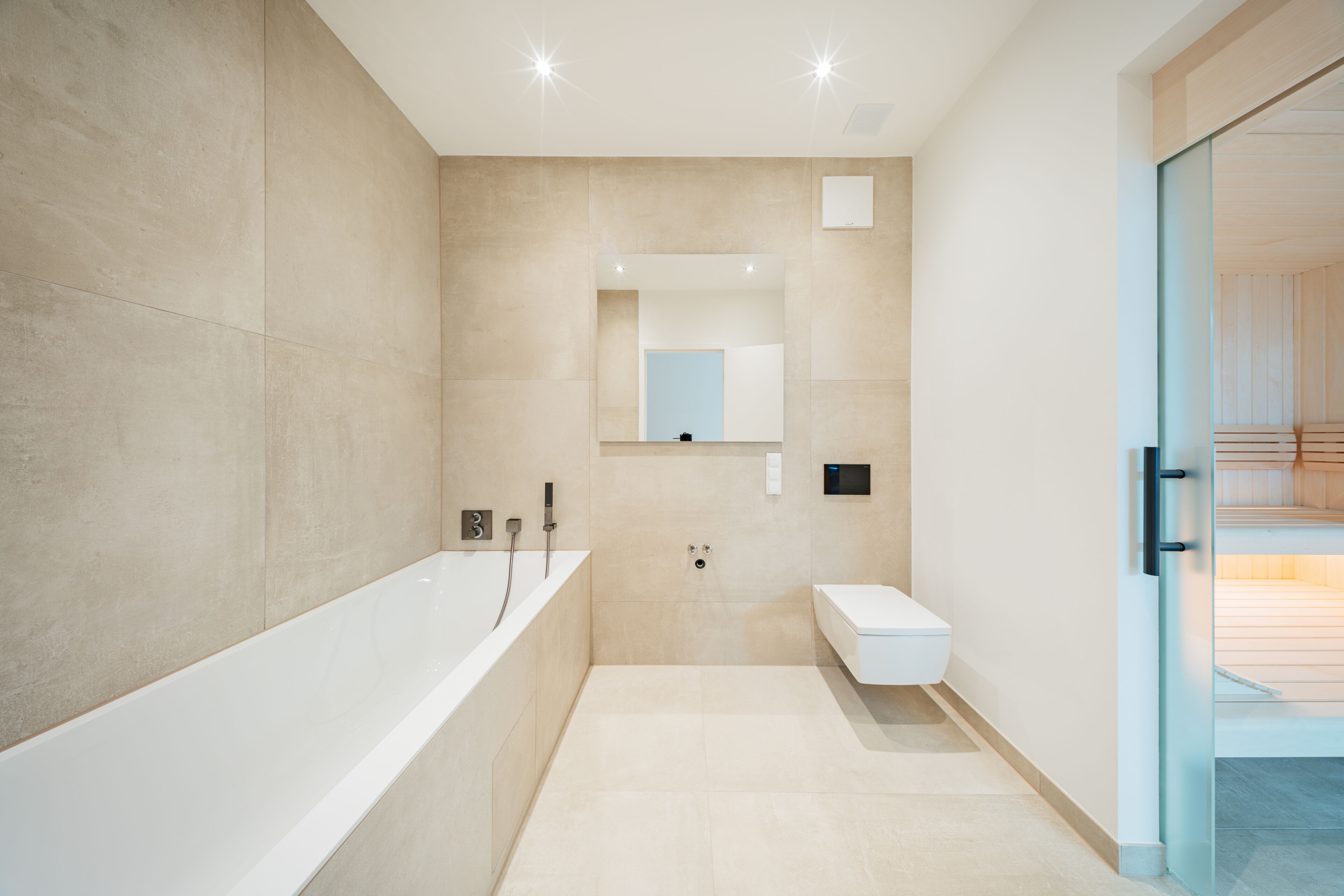 The secret of the UNIQUE villas' feel-good experience lies in the skilful interplay of great ideas and finely thought-out details. The interiors are characterised by their natural beauty thanks to high-quality oak floorboards. Large windows that let sunlight into the living spaces and allow a view of nature create echoes of the iconic architecture of the residential project. The design concept of the bathrooms is characterised by high-quality porcelain stoneware and state-of-the-art branded sanitaryware, which create an inviting and exquisite atmosphere. The living comfort is complemented by technical add-ons, such as an integrated radio in the bathroom and a smart home control system, which can be used to control the temperature and lighting from anywhere via an app.
