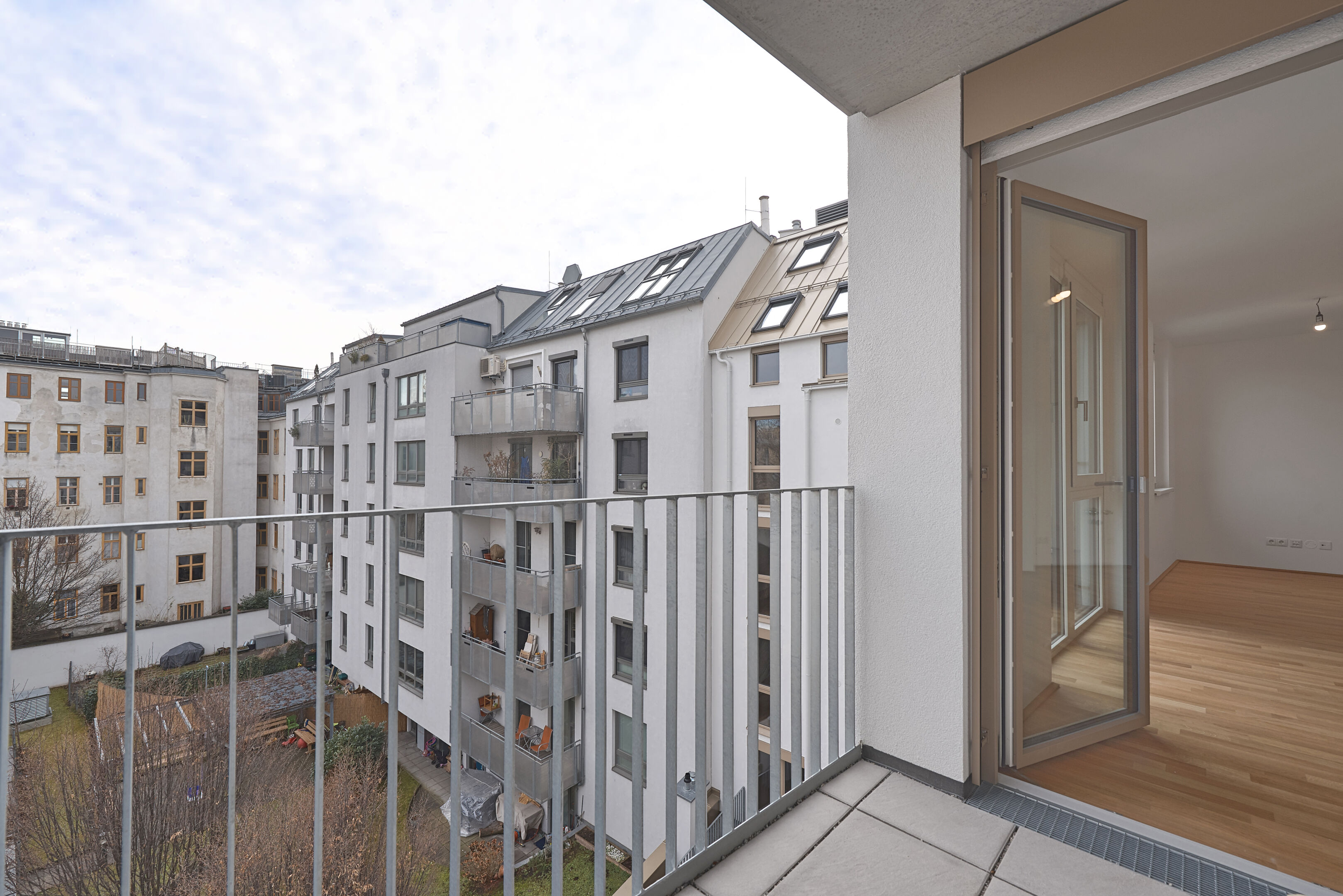 Almost all freehold flats have attractive open spaces such as balconies, loggias, terraces or private gardens. Above the flats on the ground floor with beautiful private gardens, cleverly designed residential units with 1 to 4 rooms each and sizes ranging from approx. 35 to 135 m² are being built on 4 upper floors. The flats offer either a street-side or courtyard view and an outdoor area in the form of a balcony, loggia or terrace. The crowning glory is formed by 2 attractive top floor levels, these flats offer terraces or private roof terraces and a beautiful view.