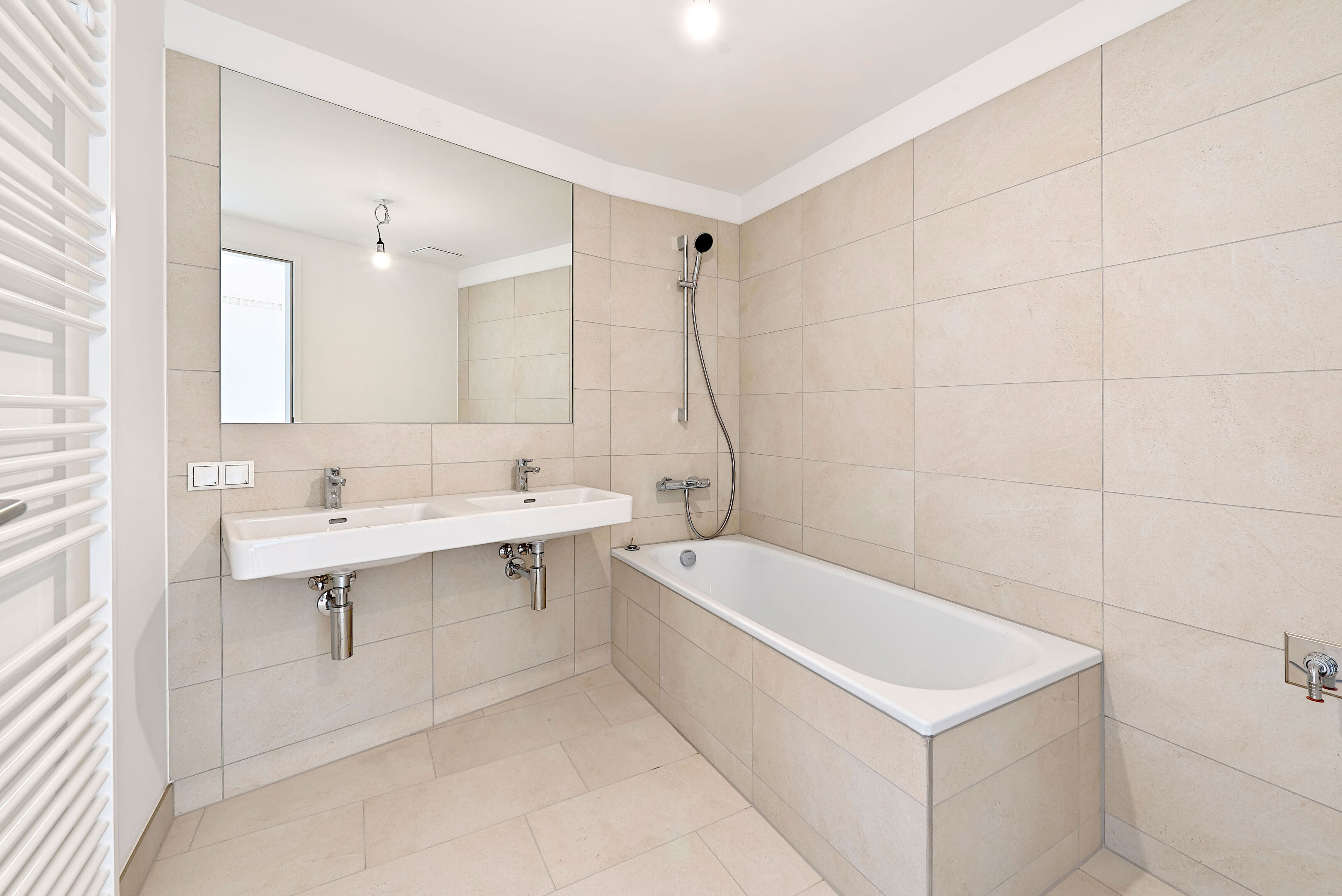 - Bathroom (approx. 5 m²) with bathtub, two washbasins and washing machine connection