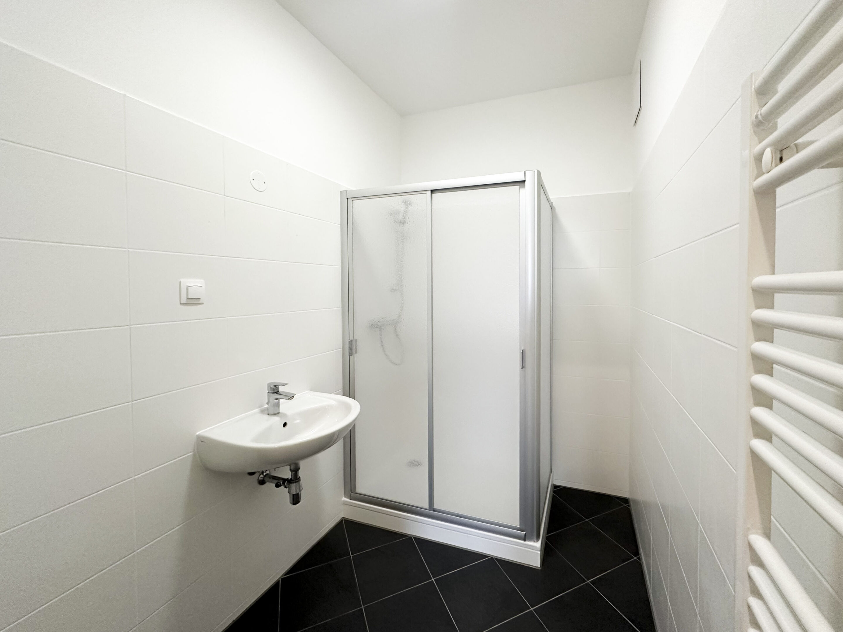 The bathroom is equipped with a shower and a washing machine connection and is directly accessible from the bedroom. The WC is separate and ideally complements the functional floor plan.