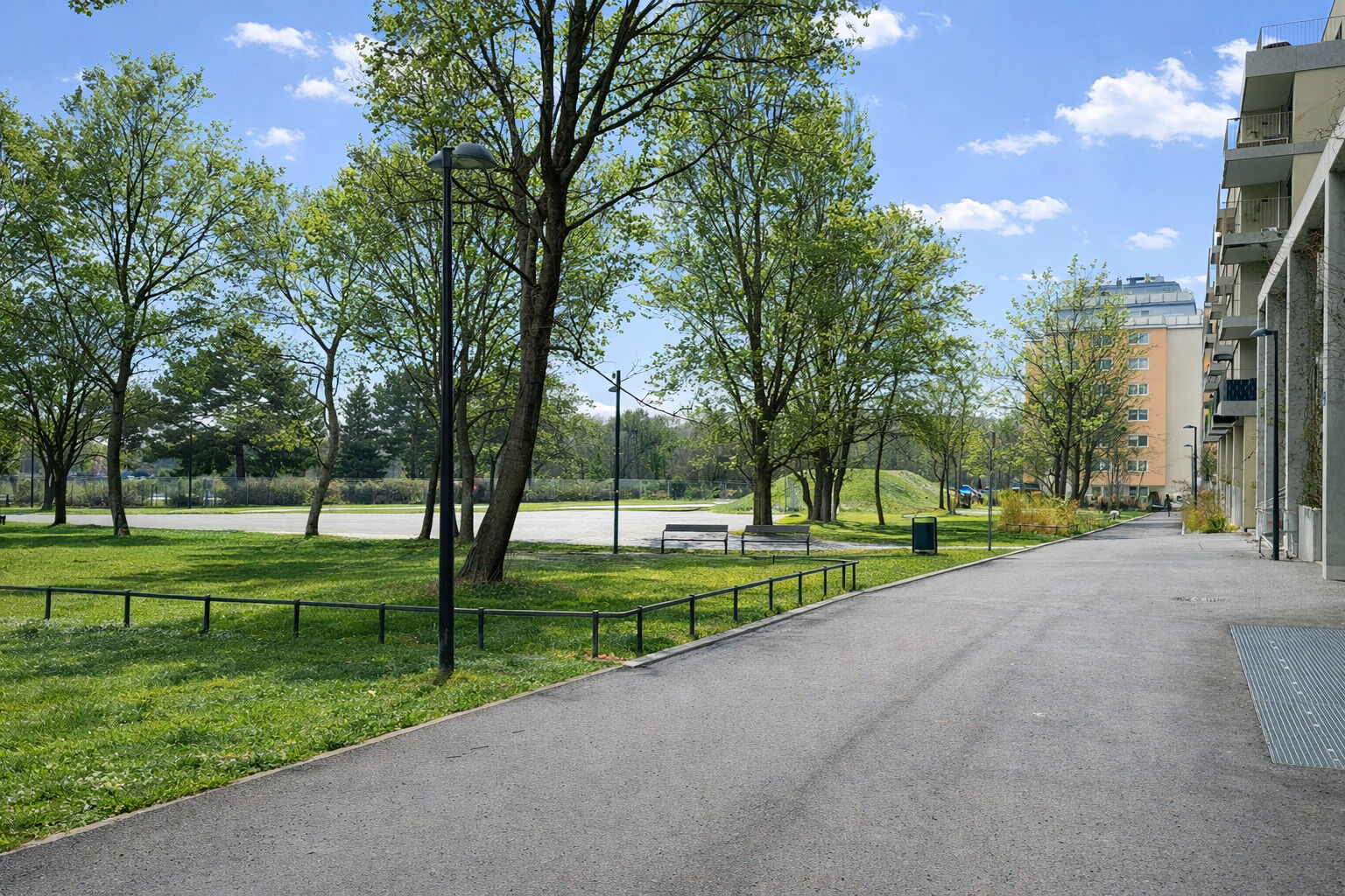 The property is located at Bertha-von-Suttner-Gasse 4 in Vienna's 22nd district and is part of a modern residential complex with three staircases. The surrounding area is characterised by a successful combination of quiet living, green open spaces and very good infrastructure.