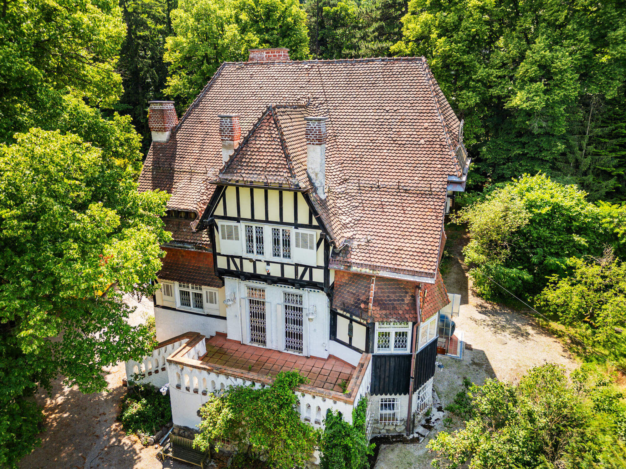 The impressive villa sits enthroned at the end of a private driveway - representative, but at the same time harmoniously embedded in the property. Properties of this type are rarely found in this exceptionally good state of preservation. As it was last unoccupied, there is now ample scope for modernisation and individual living concepts.