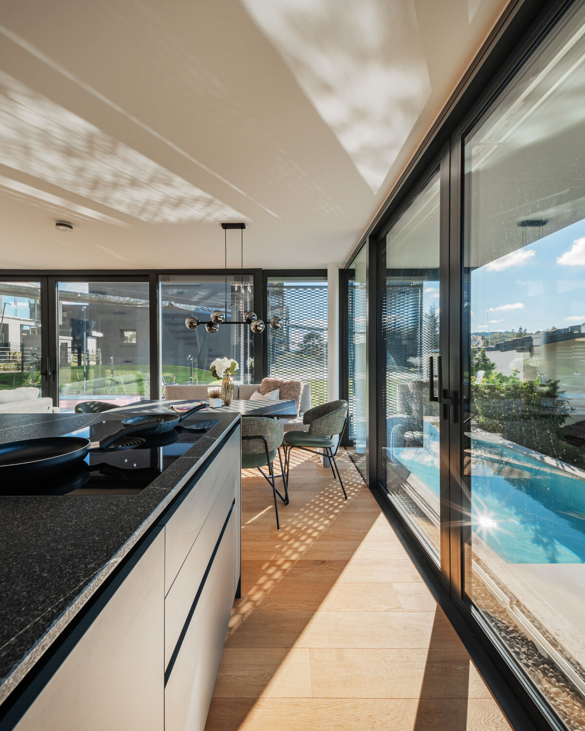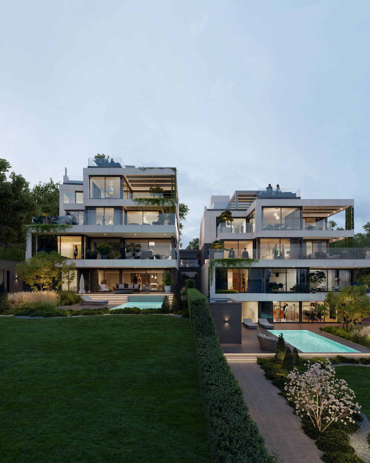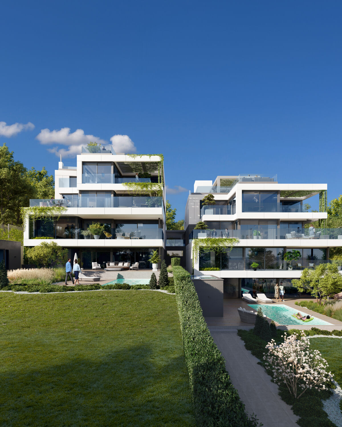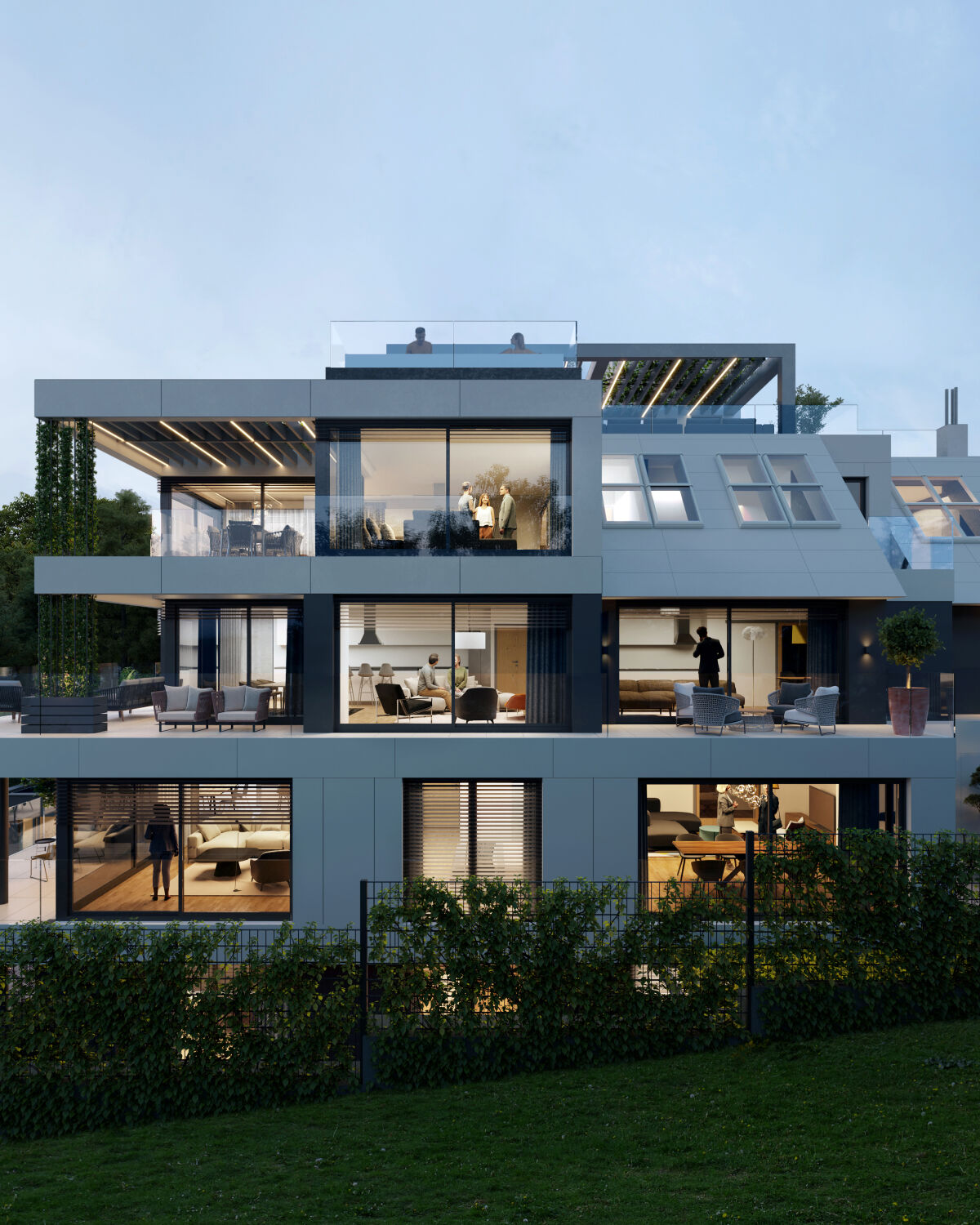 1190 ViennaNumber of apartments in total: 16At Hackenbergweg 43, 1190 Vienna, 17 exclusive villas with upmarket fittings are being built. The quiet location in the middle of the vineyards also impresses with a wonderful view of Vienna, which can be enjoyed without restriction from the private terraces and balconies. The skilfully designed villas are spread over 3 floors and are harmoniously complemented by private pools and parking spaces. The turnkey handover is scheduled for summer 2023. -