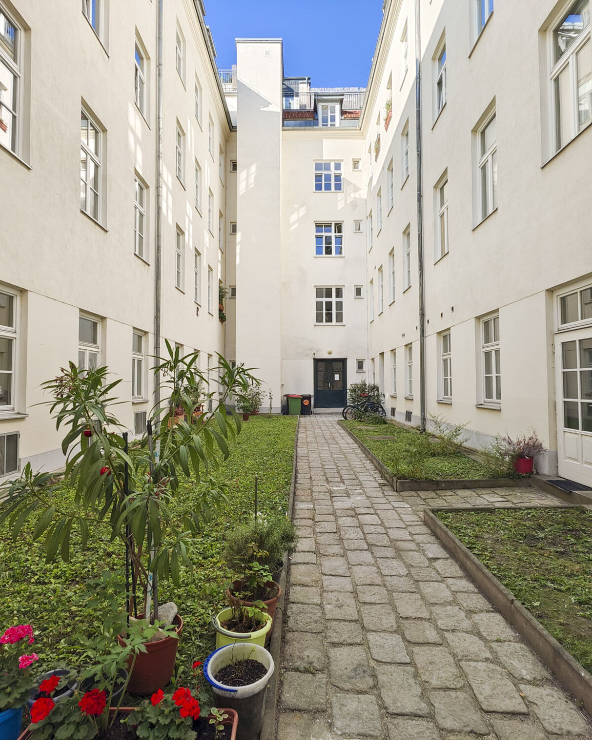 1070 ViennaThis unique apartment block at Burggasse 97, 1070 Vienna, is particularly eye-catching due to its small number of storeys - one ground floor and two standard floors. Contrary to what the structured façade might suggest, the charming inner courtyard contains numerous old flats in a quiet courtyard location, most of which are accessible via pavements. -