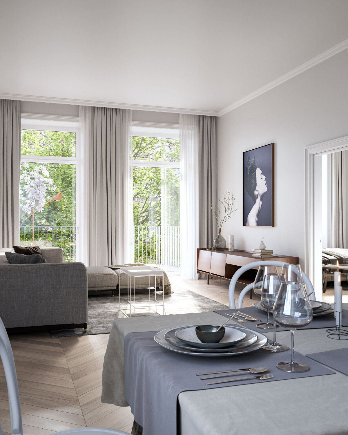 1090 ViennaThe magnificent Wilhelminian-style building at Widerhoferplatz 1, 1090 Vienna, acquired by 3SI Immogroup in 2022, will be extensively revitalised in 2022/23 and developed under the project title "Grand Park Residence". Not only are the spacious 4- to 6-room flats in the apartment block built in 1909 by master builder and architect Marshall Johann impressive, but also the enchanting balconies, which offer wonderful views over the neighbouring park. -