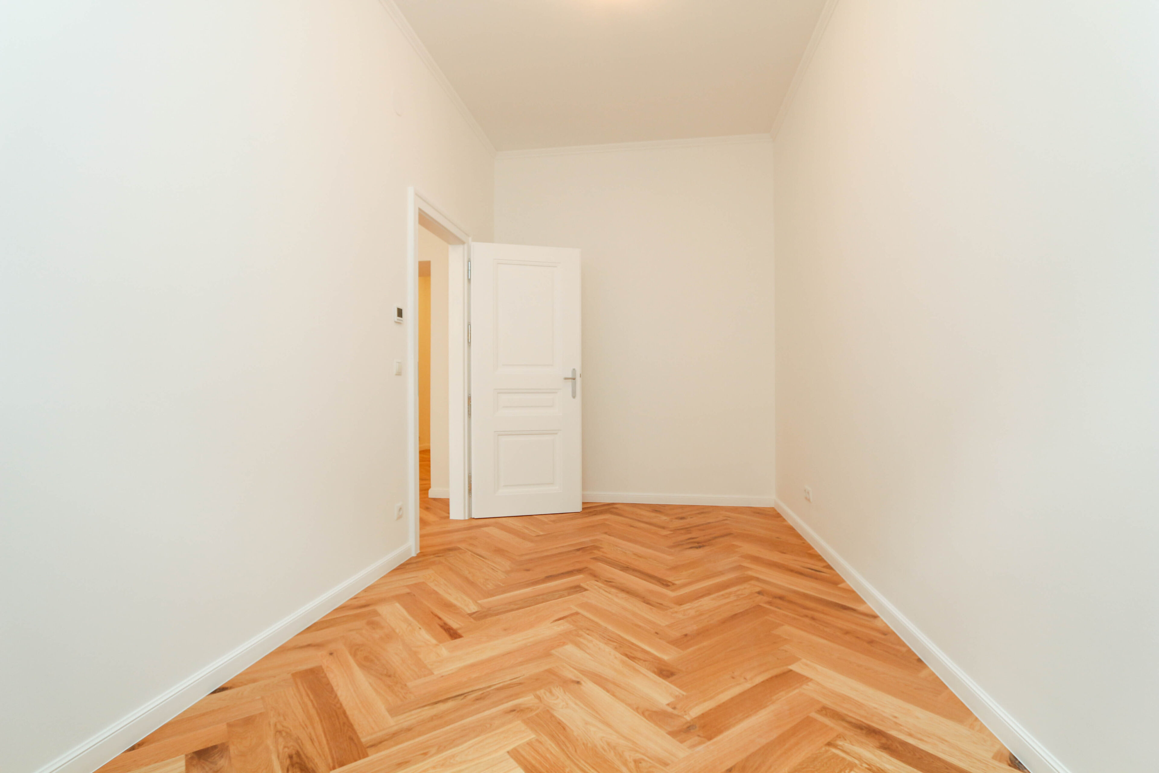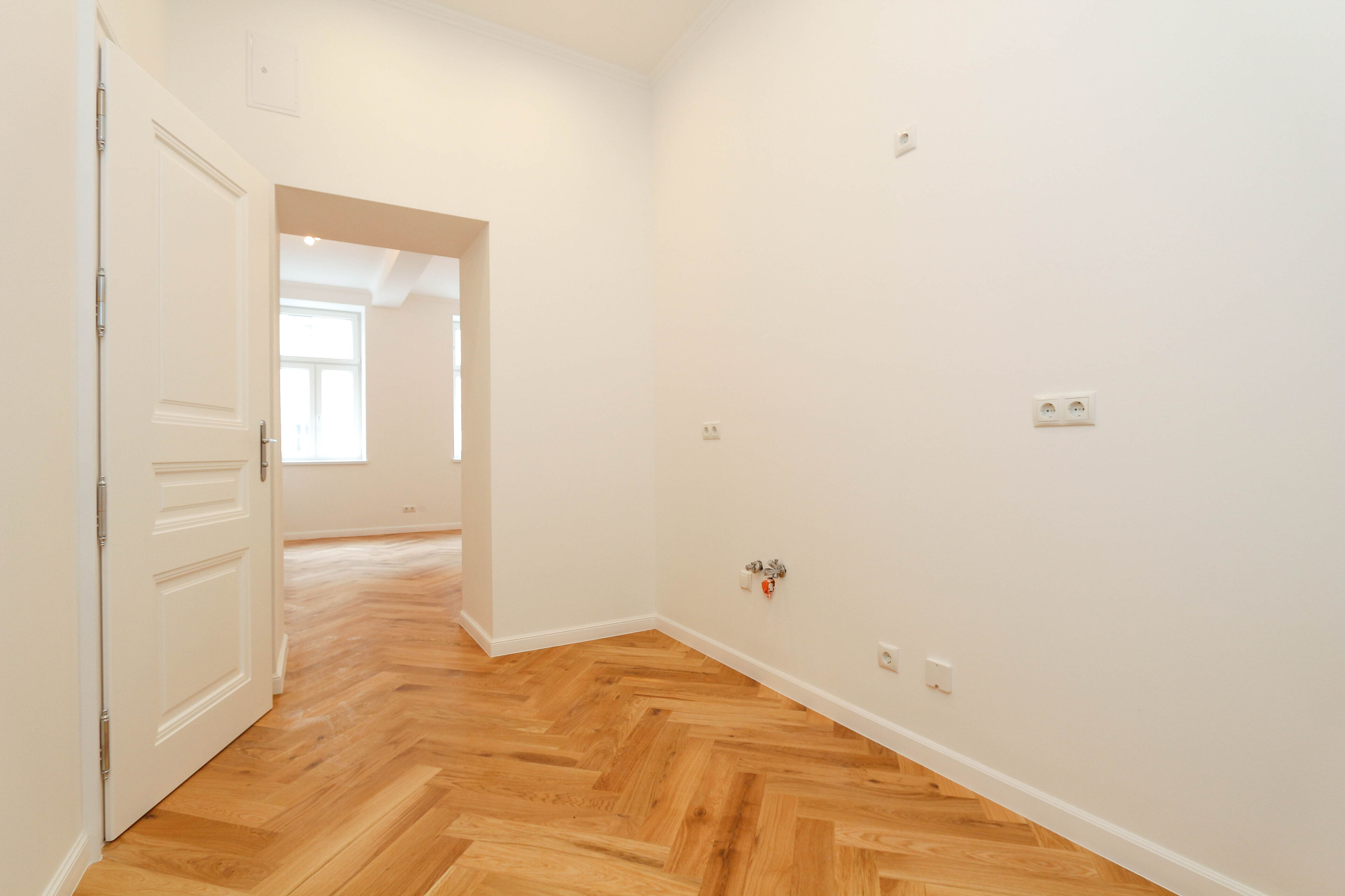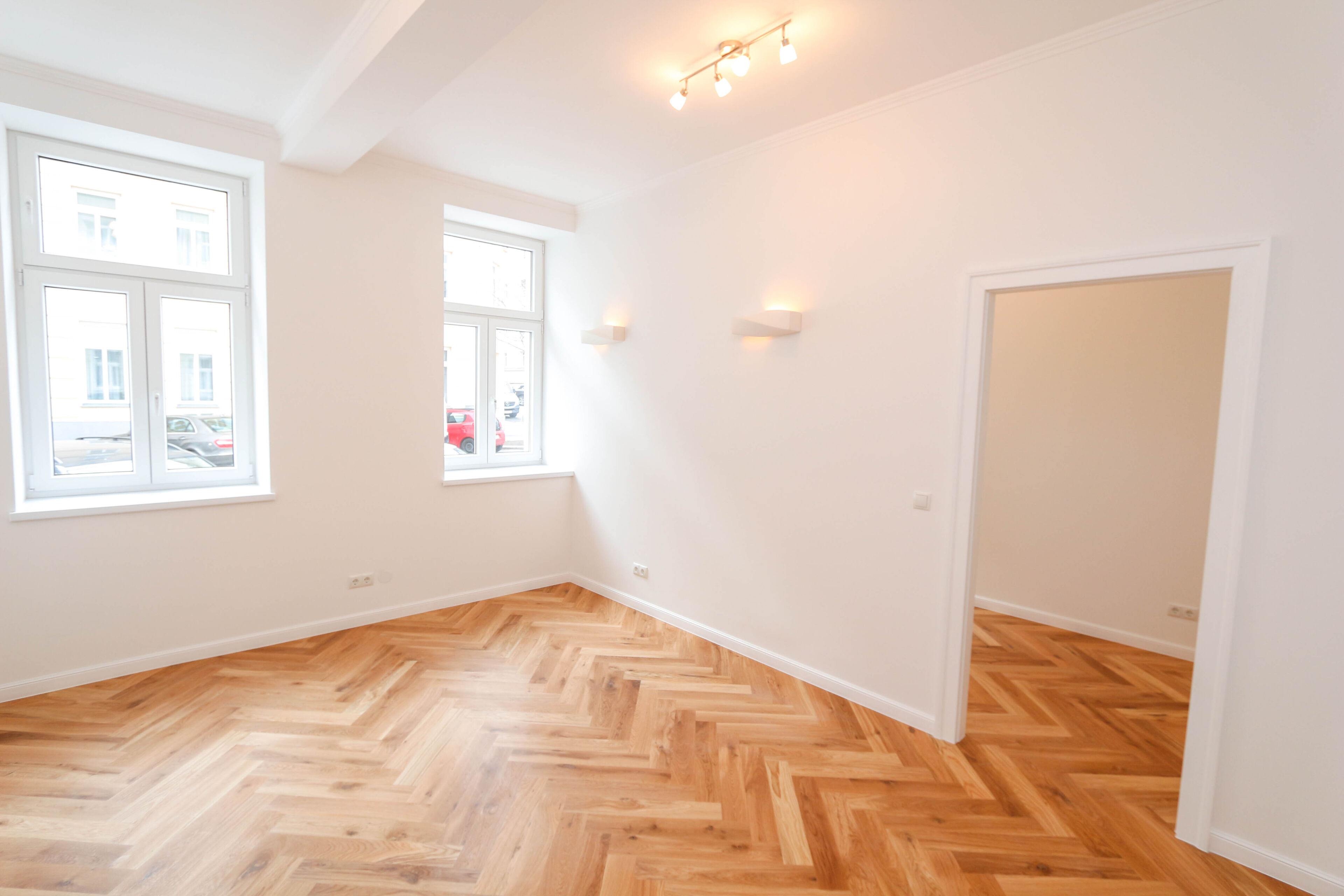 Zum Verkauf gelangt eine eben generalsanierte 3-Zimmer-Wohnung im Erdgeschoß eines klassischen Stilaltbaus.